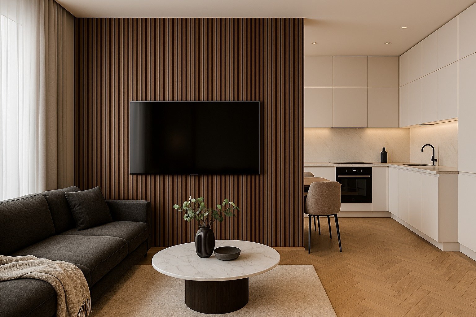 New Walnut akustinė sienų plokštė – elegancija ir akustinis komfortas