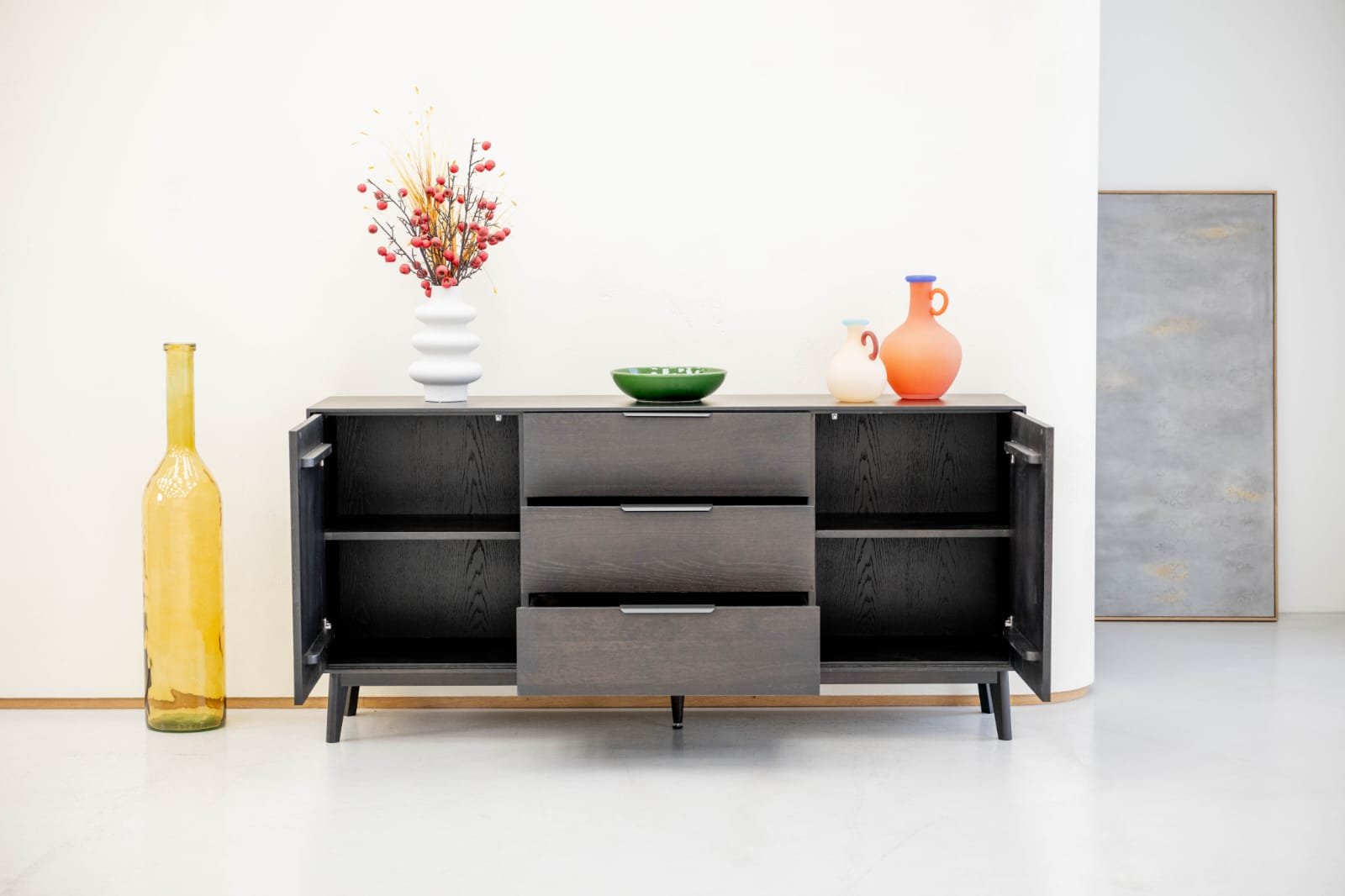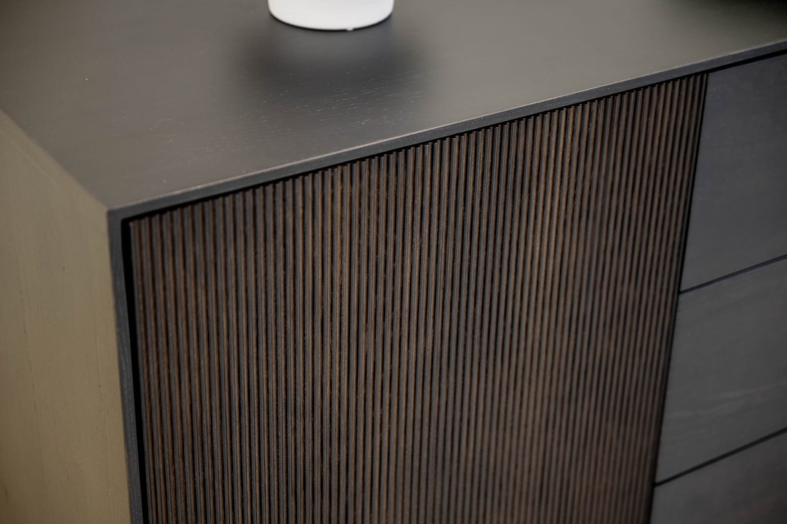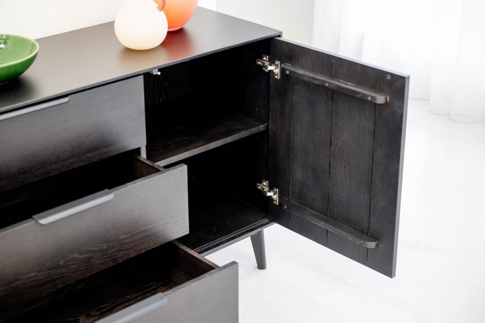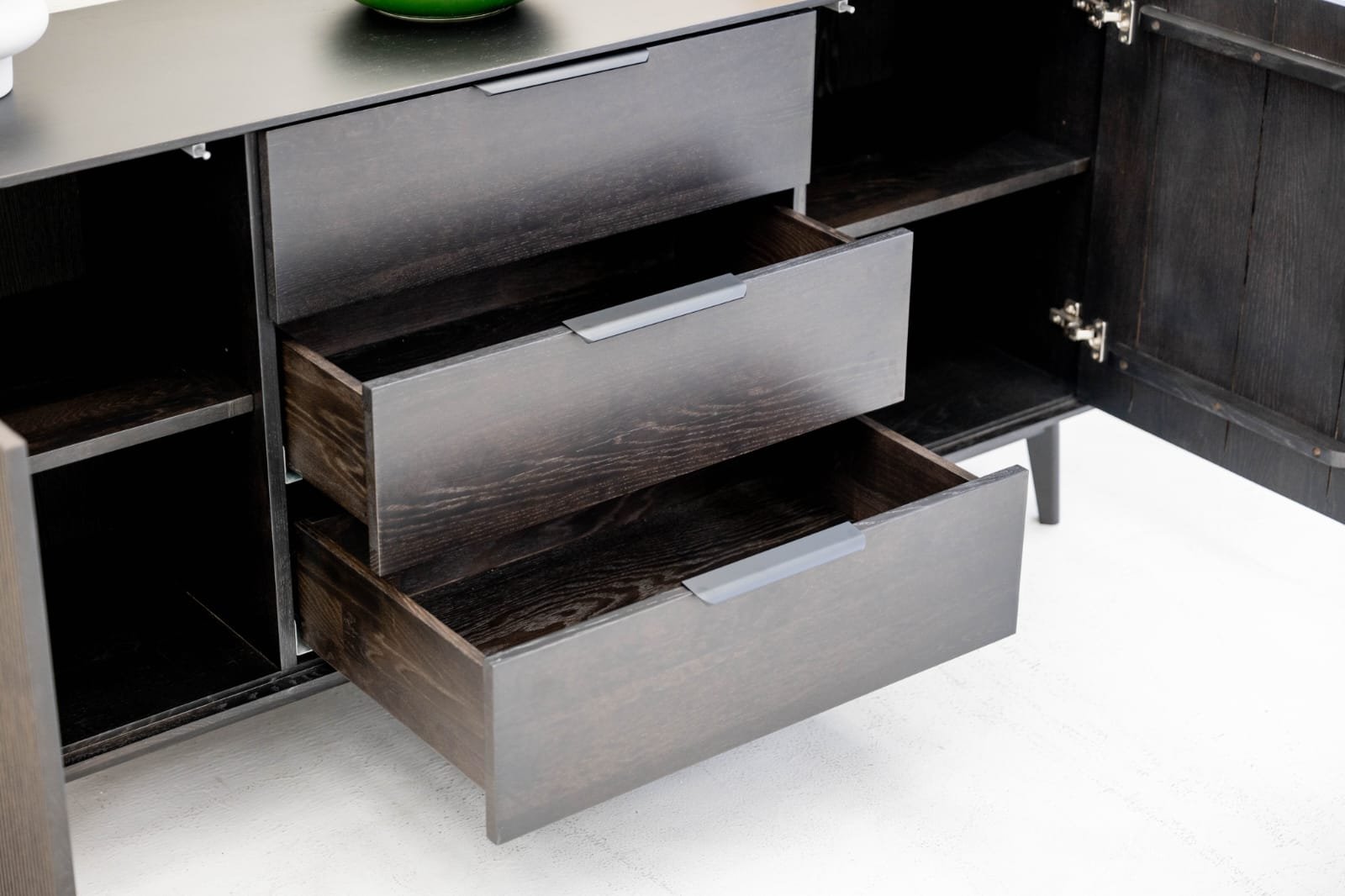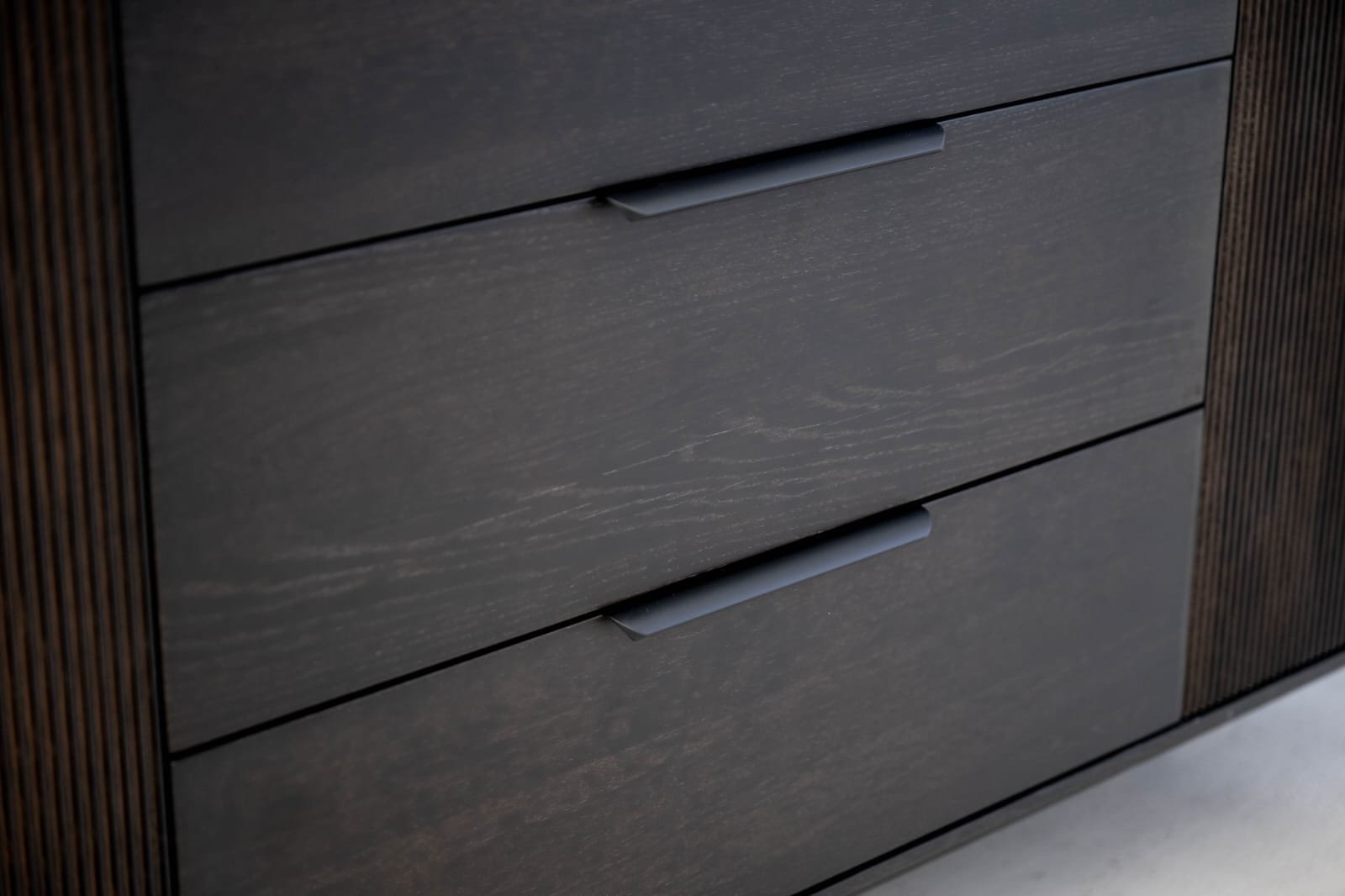 ALTO komoda – tai modernus baldas, pagamintas iš 100% masyvaus ąžuolo, užtikrinančio ilgaamžiškumą ir išskirtinę estetiką. Komoda turi tris erdvius stalčius bei dvi dureles su vidinėmis lentynomis, todėl lengvai pasirūpinsite tvarka ir daiktų organizavimu. Juodas, subtiliai išryškintas ąžuolo raštas suteikia baldui prabangos, o minimalistinės rankenėlės – šiuolaikiškumo.