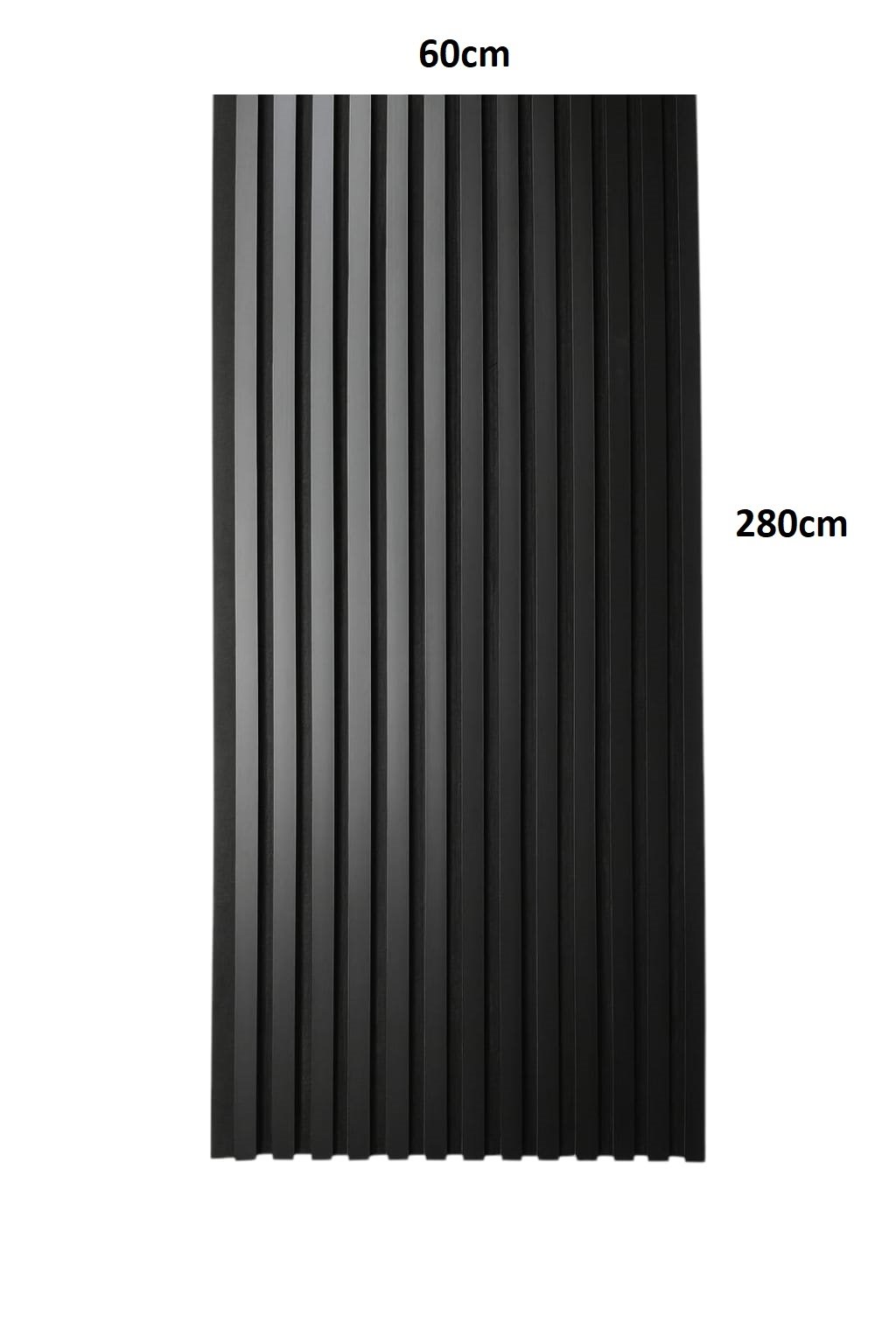 Akustinė plokštė BLACK 280 (280×60 cm) su juodomis lamelėmis ir juodu veltiniu. Gaunate elegantišką, garsą sugeriantį sprendimą moderniam interjerui – tinka sienoms ar luboms.