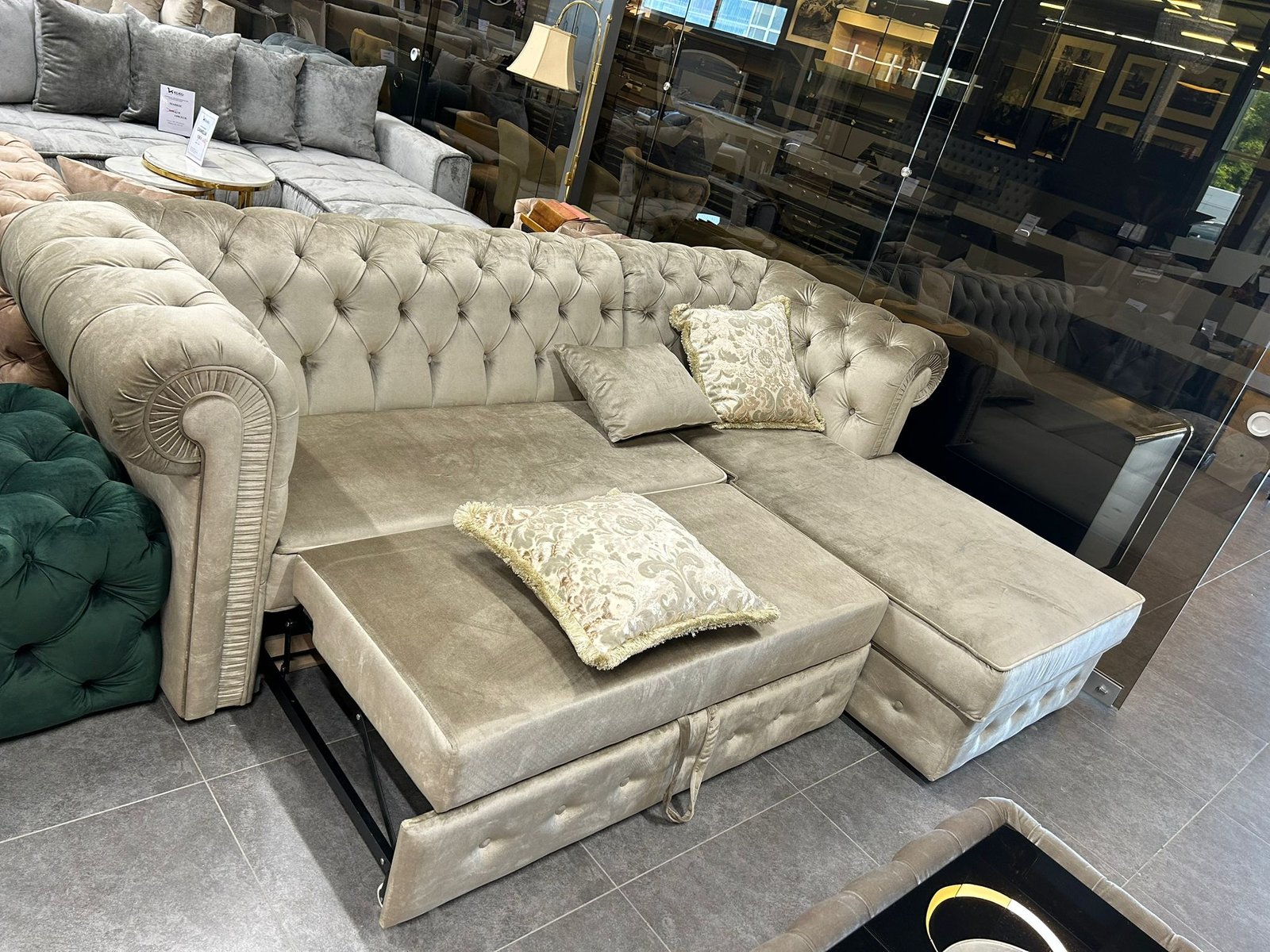 Chester kampas (270x190x90 cm) – klasikinė kampinė sofa su patalynės dėže ir miego mechanizmu. Elegantiškas „chesterfield“ stilius, prabanga ir praktiškumas viename.