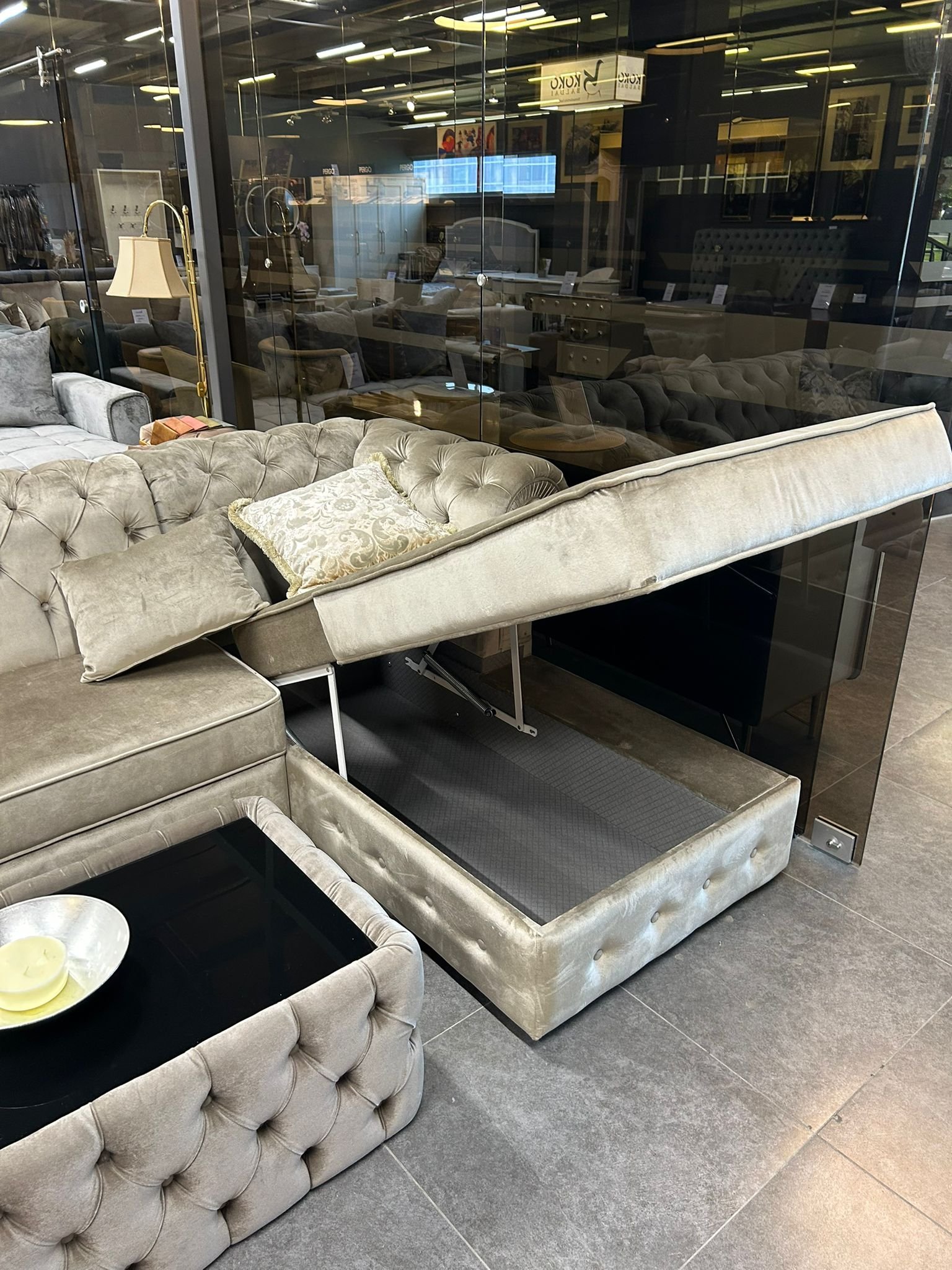 Ši kampinė sofa turi erdvią patalynės dėžę bei patogų miegojimo mechanizmą, todėl lengvai transformuojama į lovą svečiams ar kasdieniam poilsiui. Tai baldas, kuris sujungia išskirtinį dizainą ir praktiškumą, sukurtas tiems, kurie vertina kokybę ir stilių.