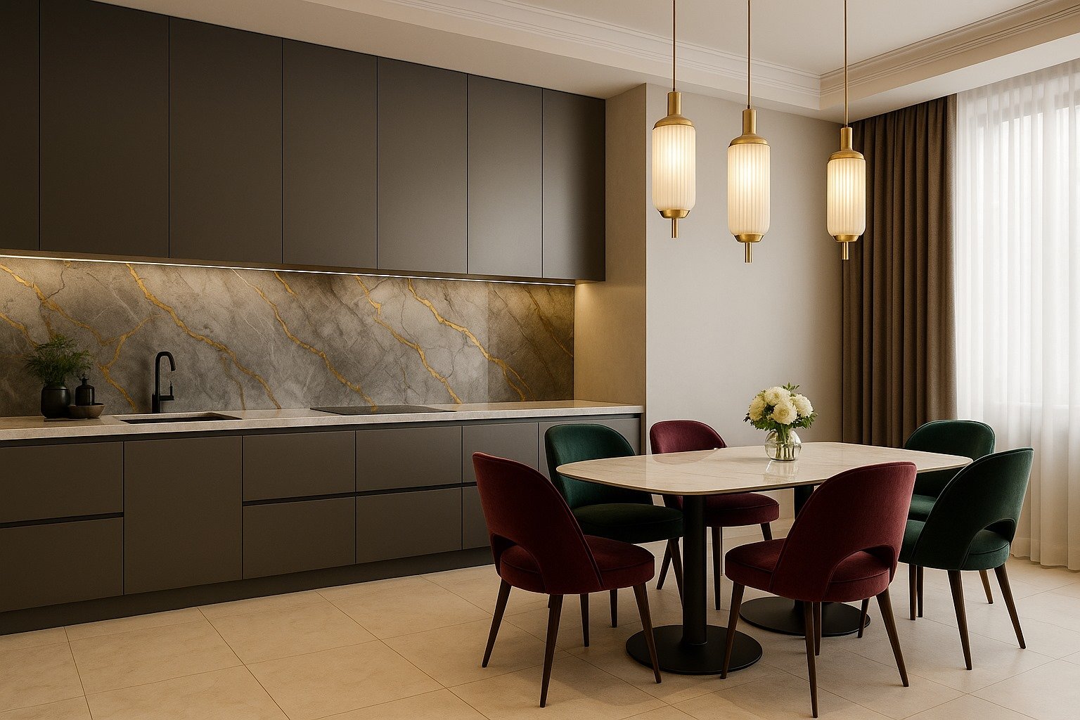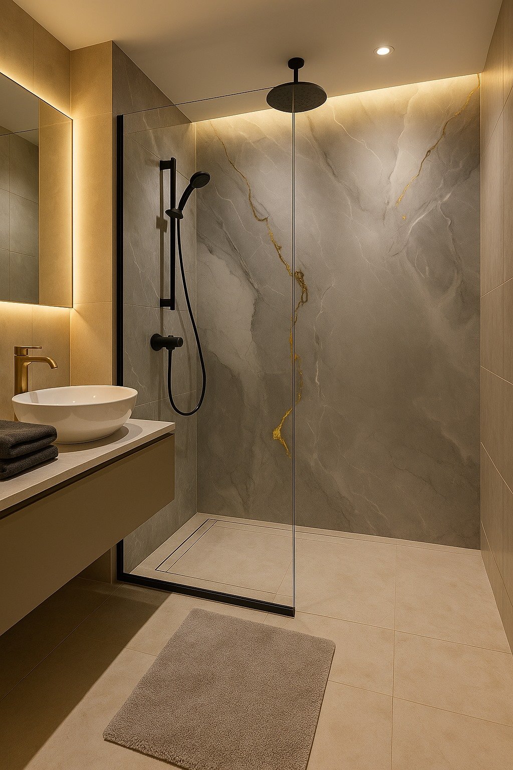 Gold Mist plokštė puikiai tinka tiek moderniems minimalistiniams interjerams, tiek prabangioms Art Deco erdvėms. Jos aukso gyslos suteikia interjerui šilumos ir prabangos pojūtį, o pilkšvas fonas išlaiko švarų ir rafinuotą įvaizdį.