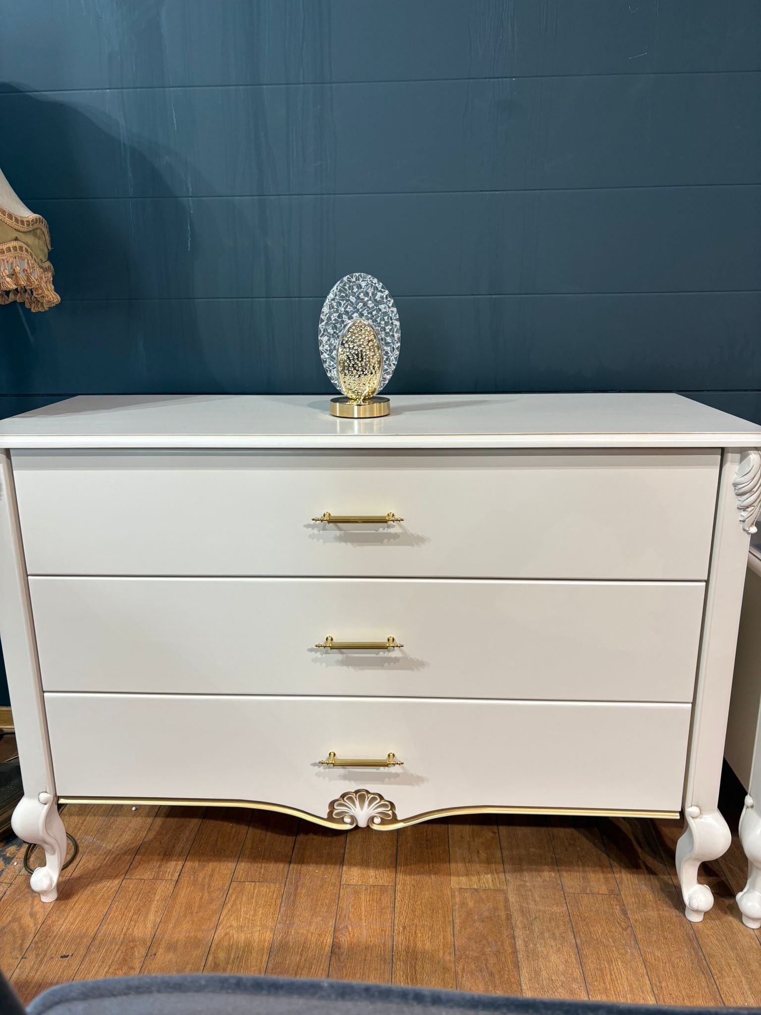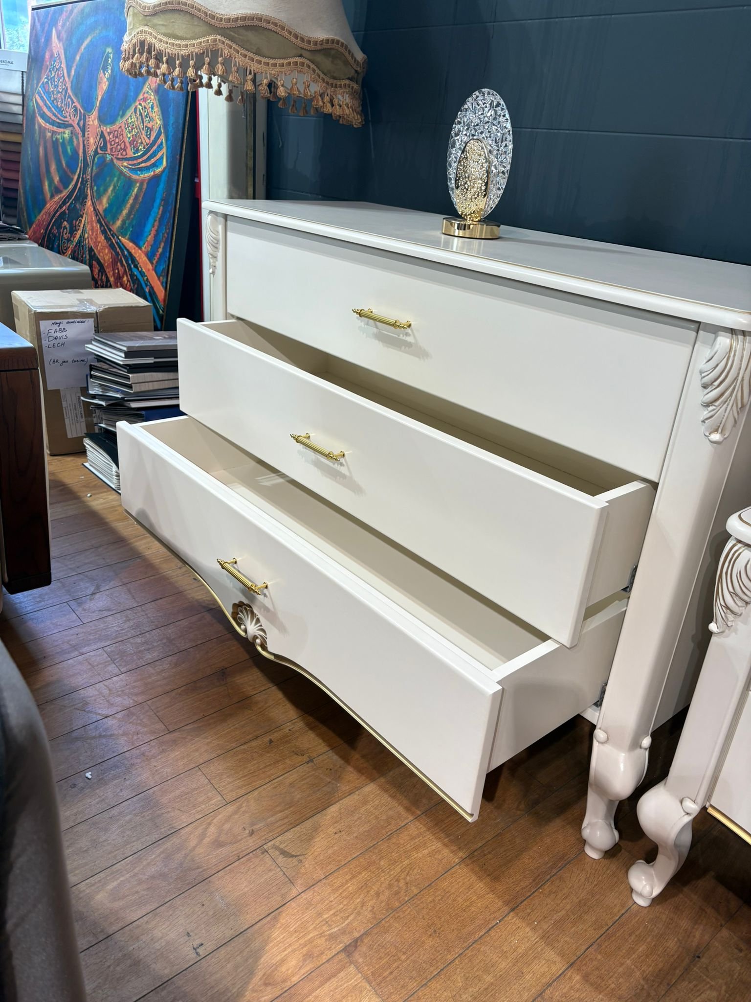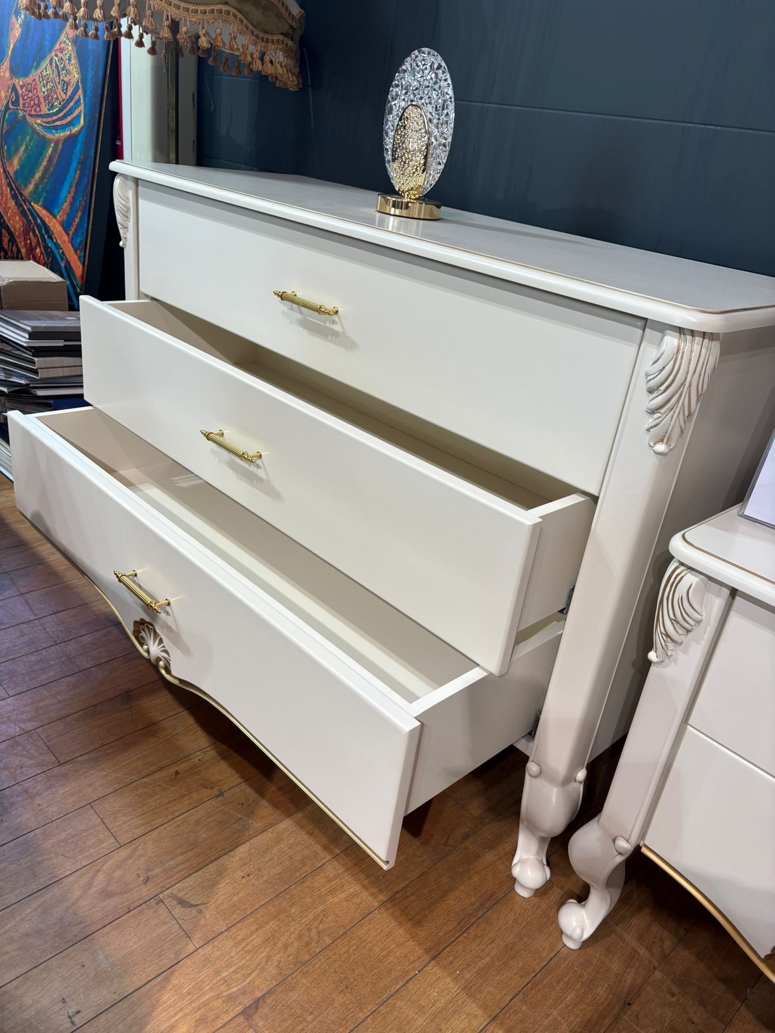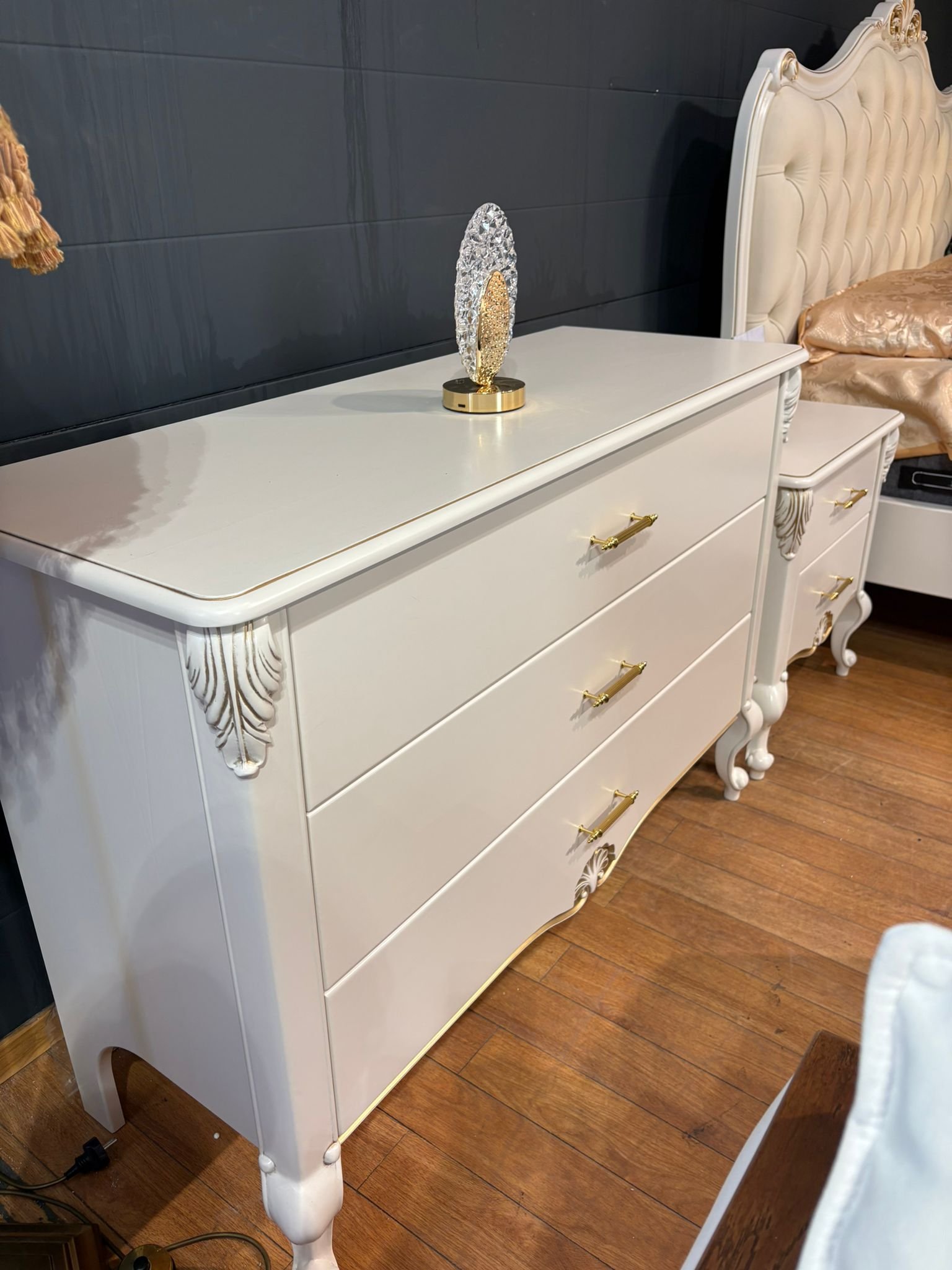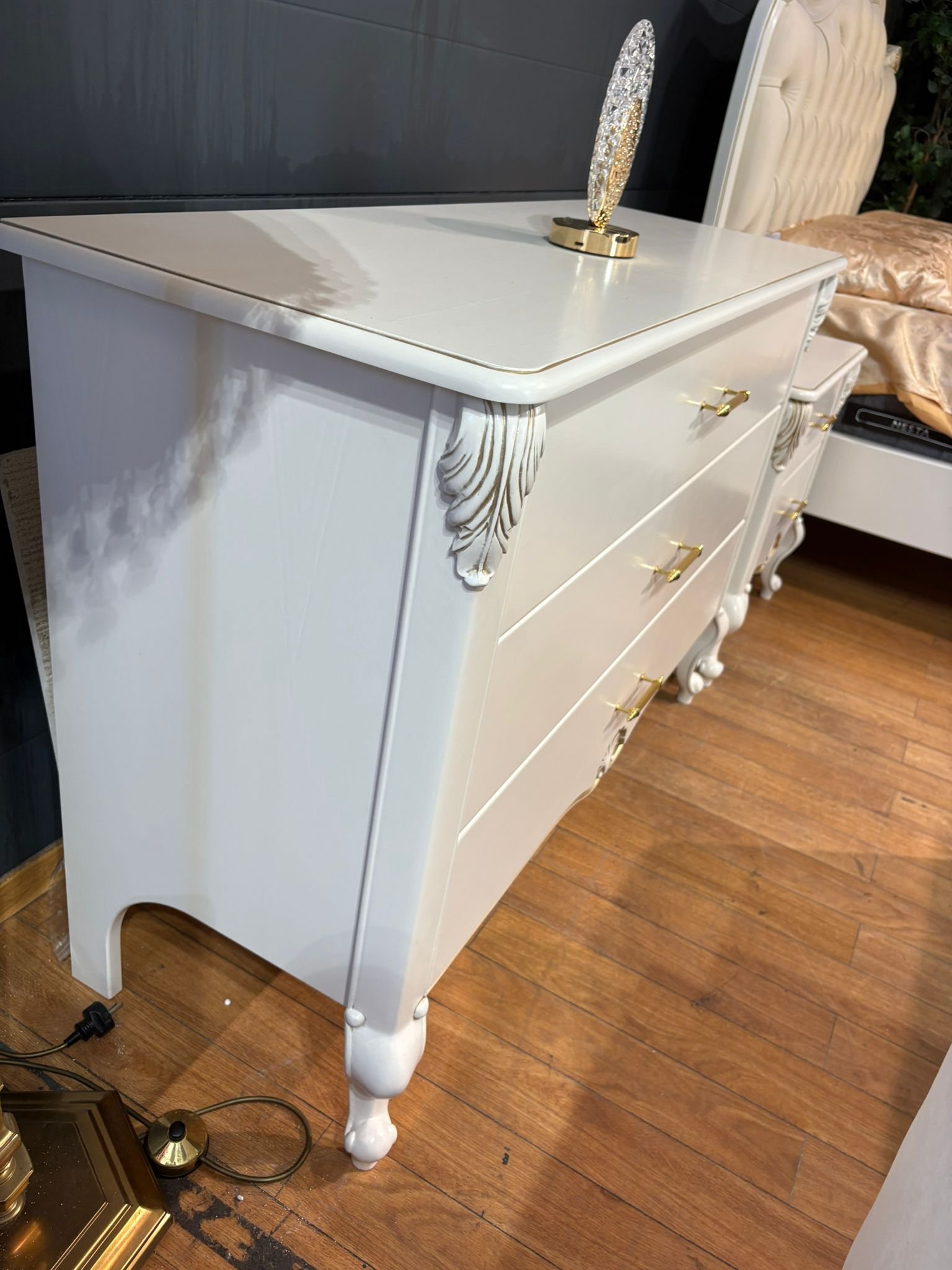 LUI klasikinė komoda – tai baldas, sukurtas tiems, kurie vertina rafinuotą grožį ir nepriekaištingą kokybę. Švelniai balta spalva, subtilūs auksiniai akcentai ir dekoratyvūs raižiniai suteikia baldui karališko žavesio, o grakščios kojelės – lengvumo pojūtį.
