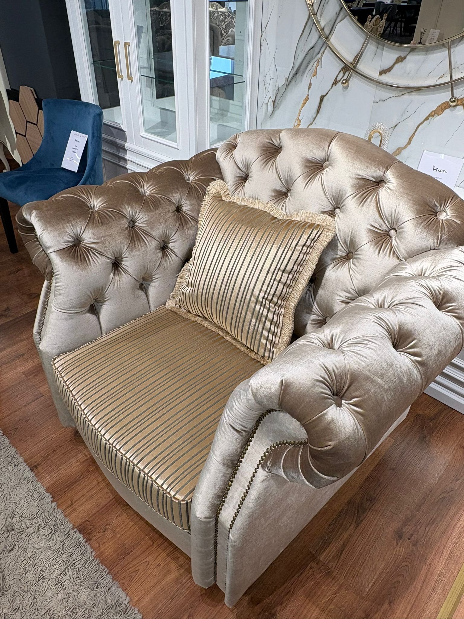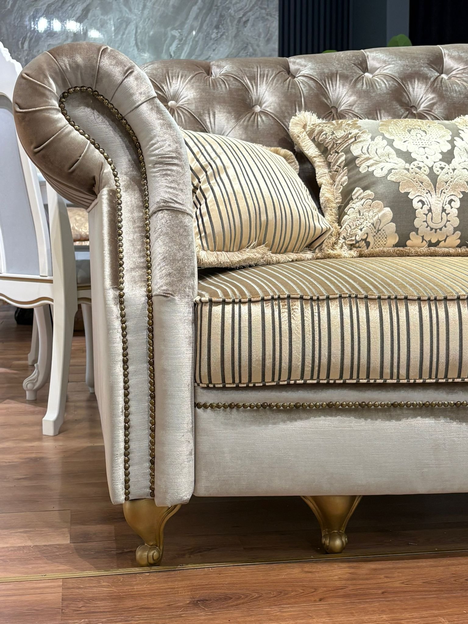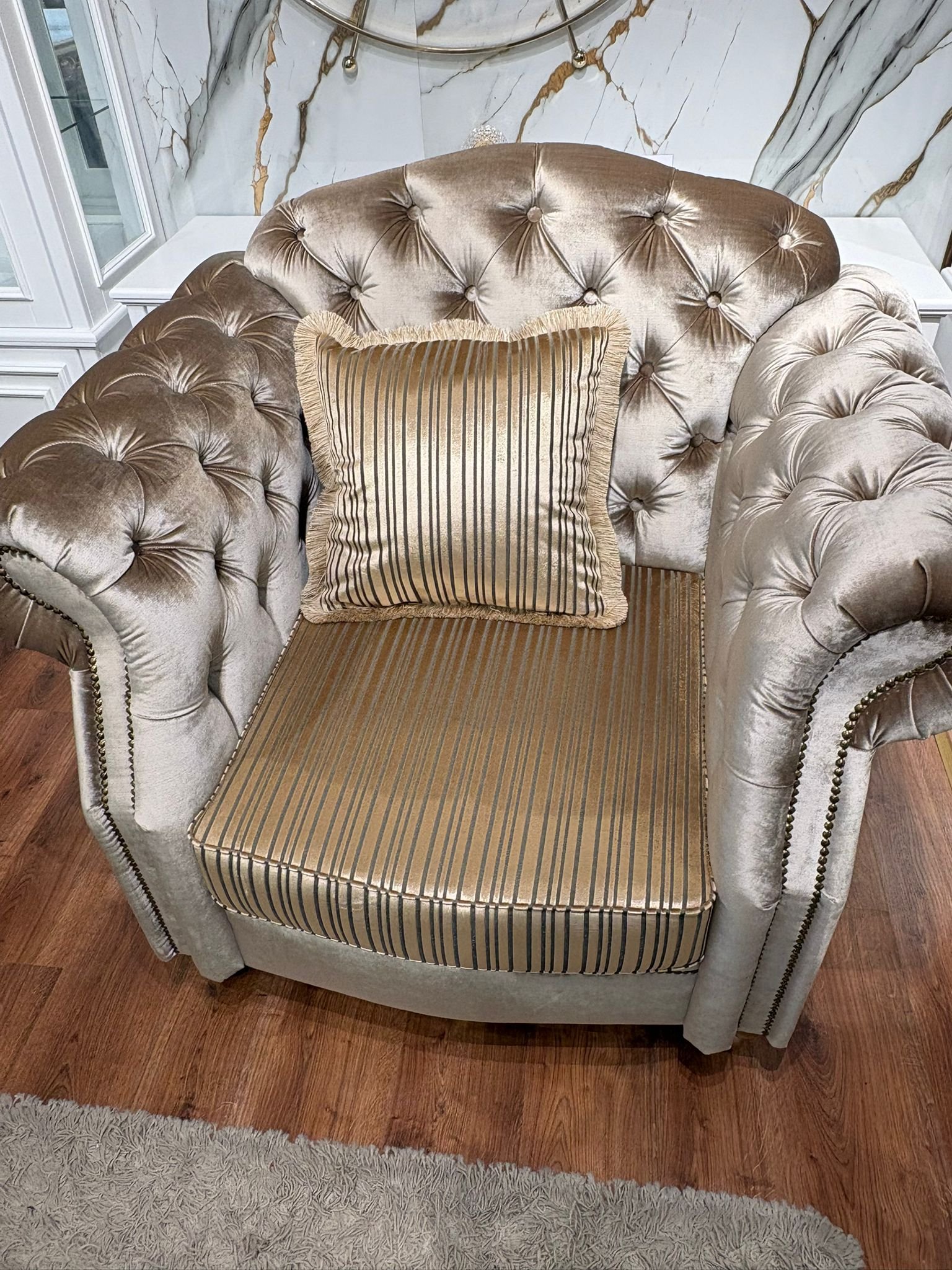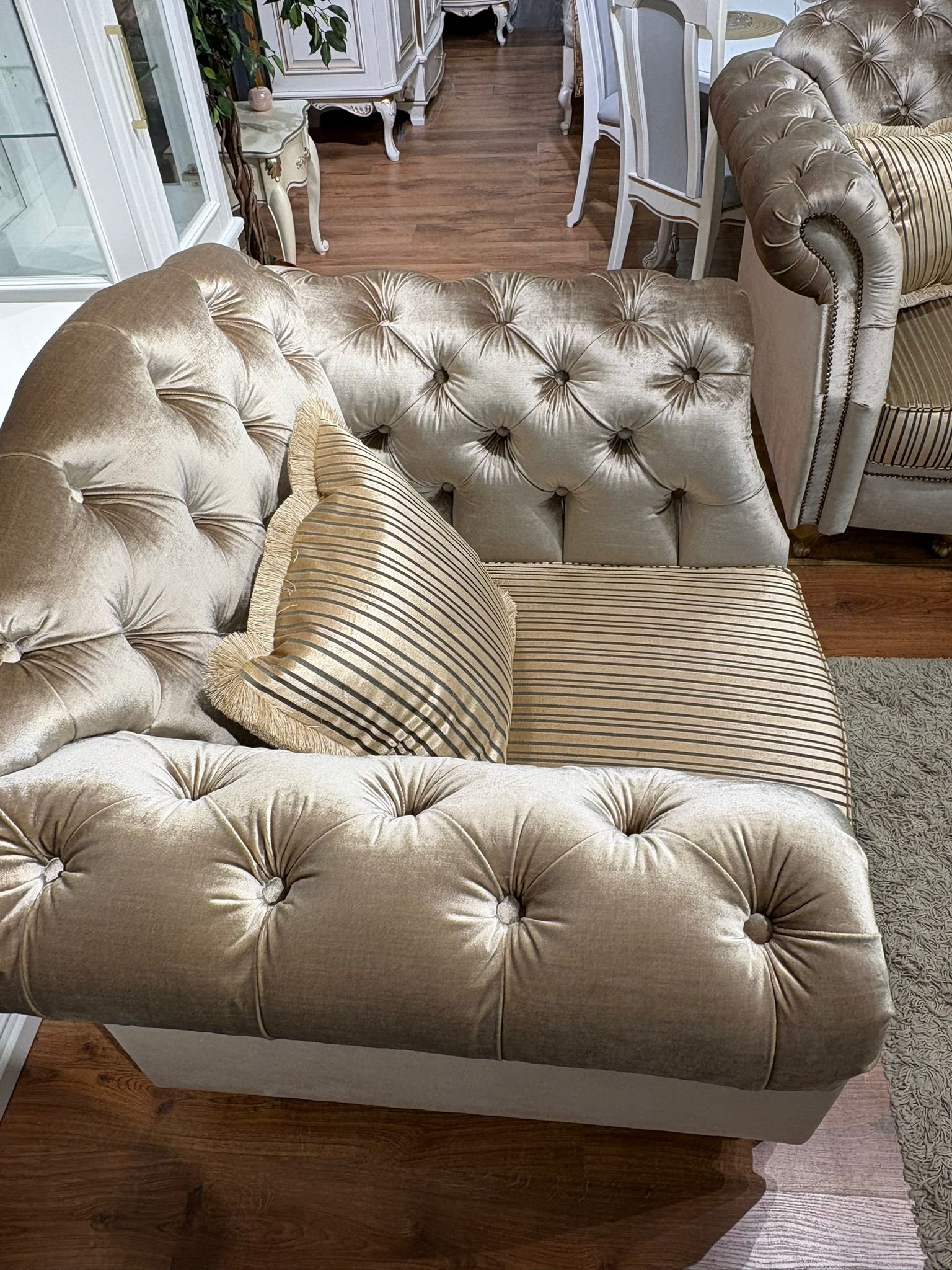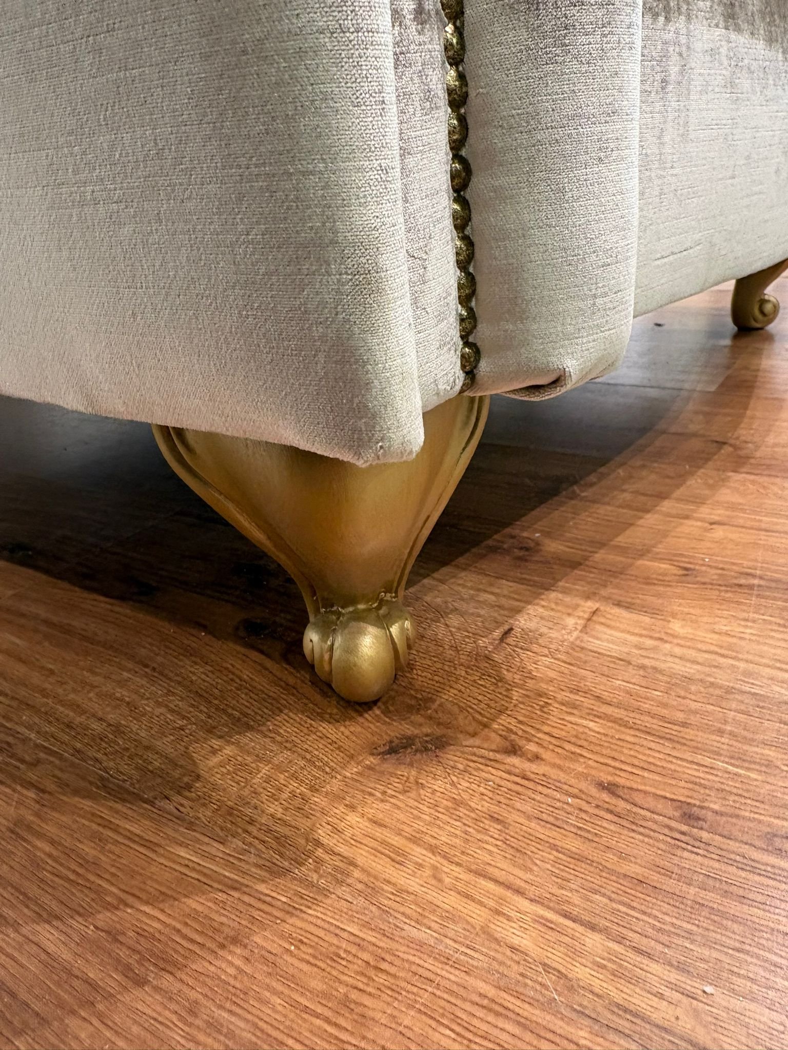 Baldai aptraukti blizgiu itališko dizaino veliūru, ant medinių kojelių, porankiai dekoruoti vinukais.