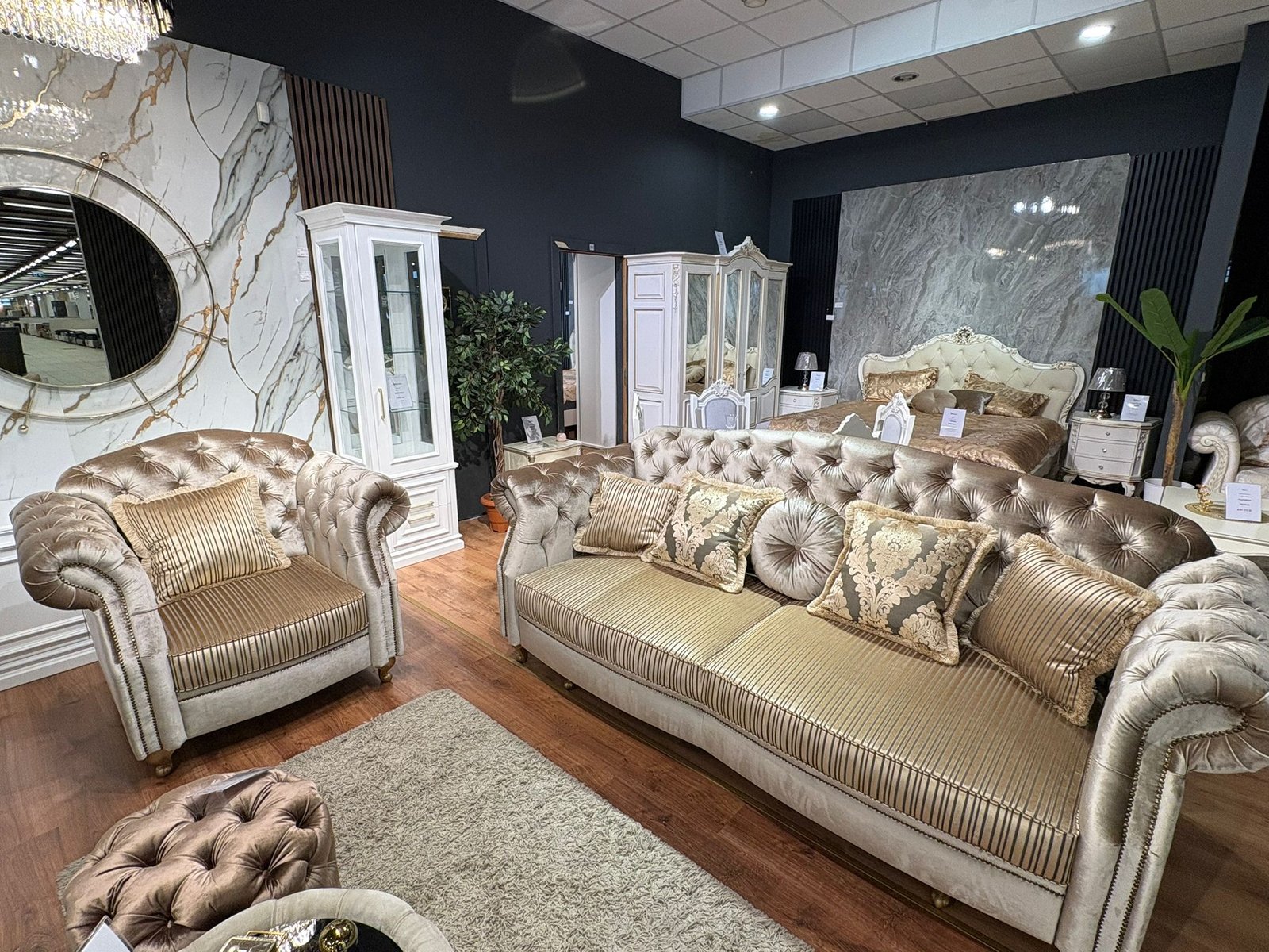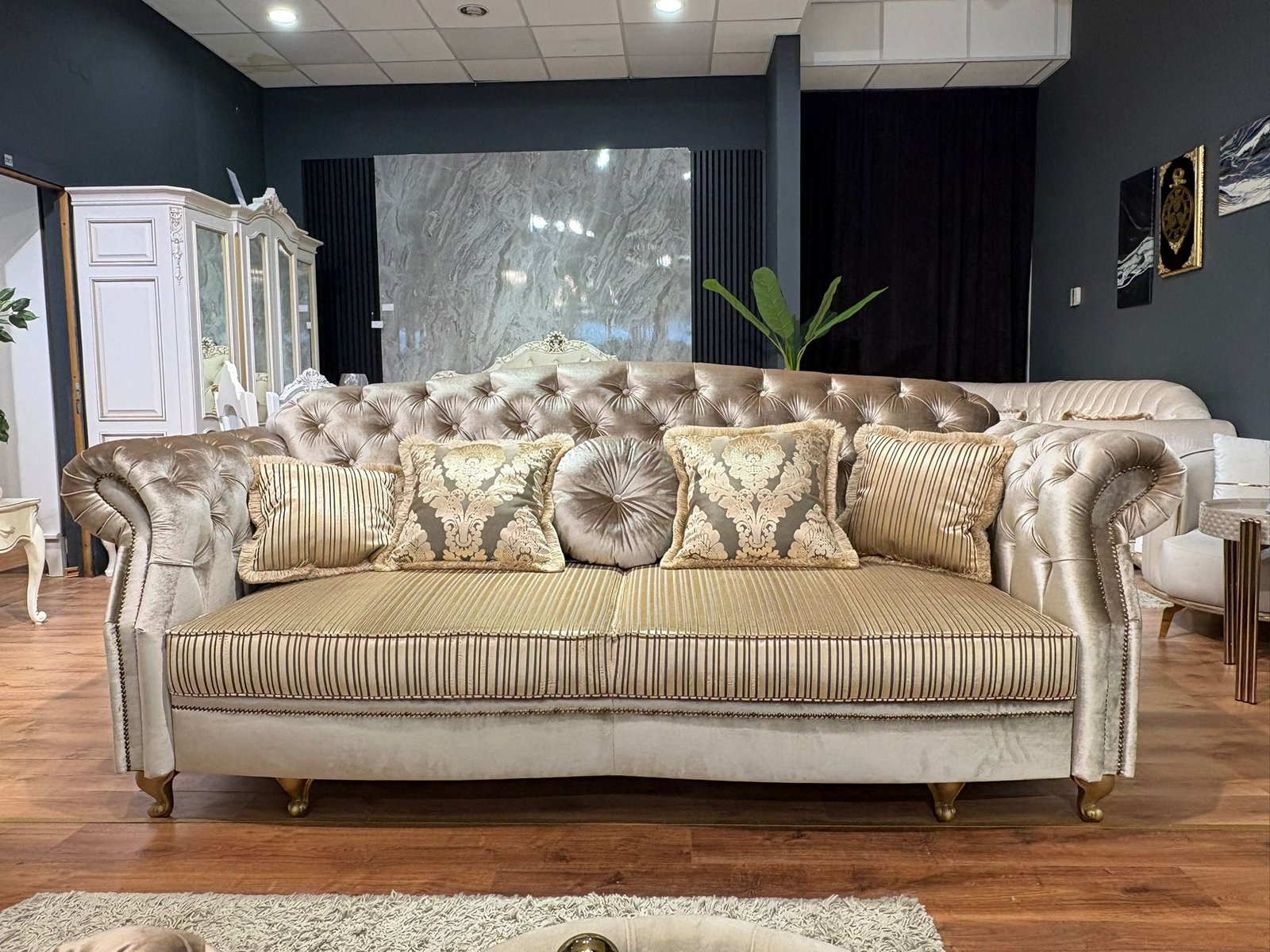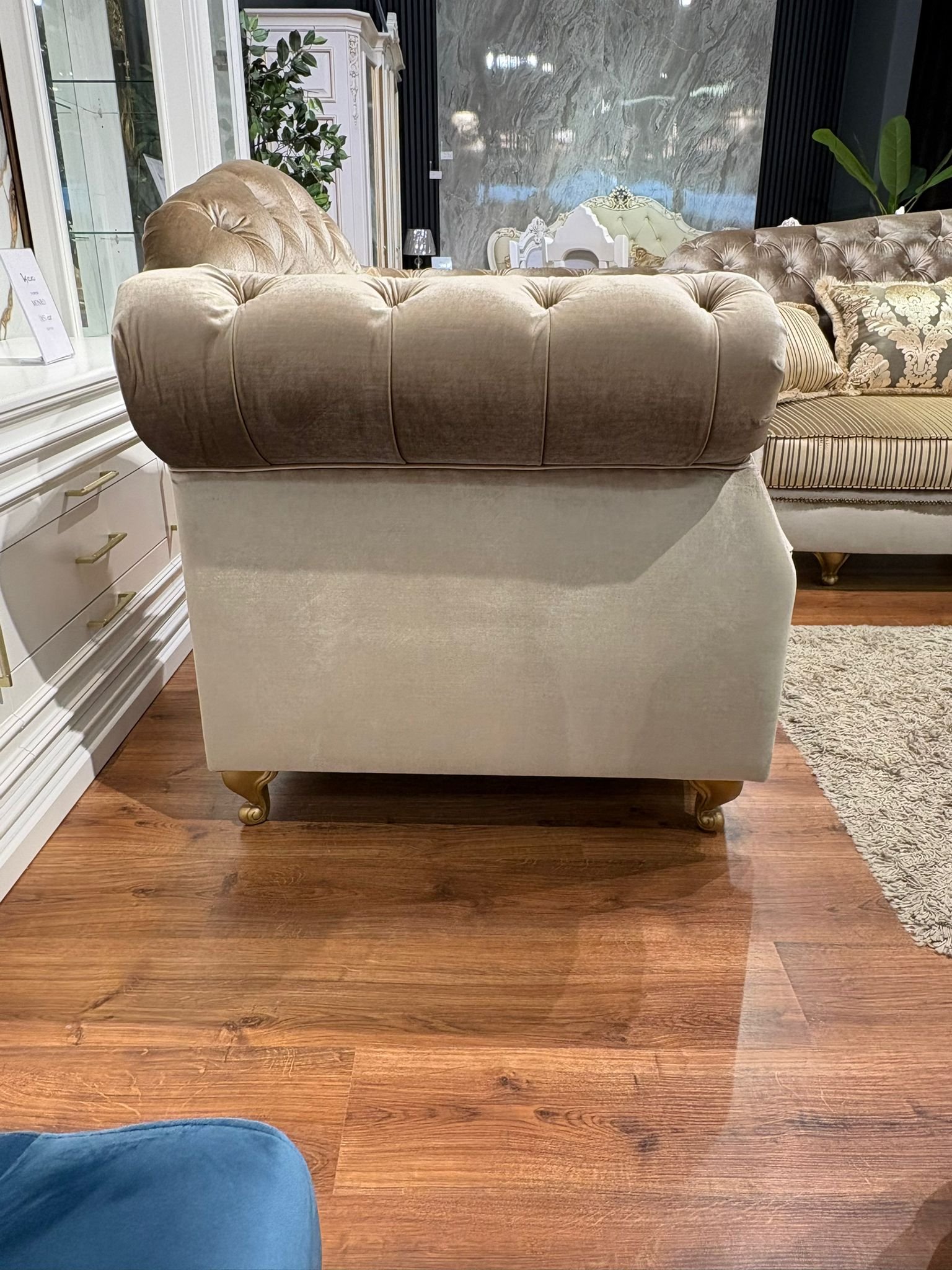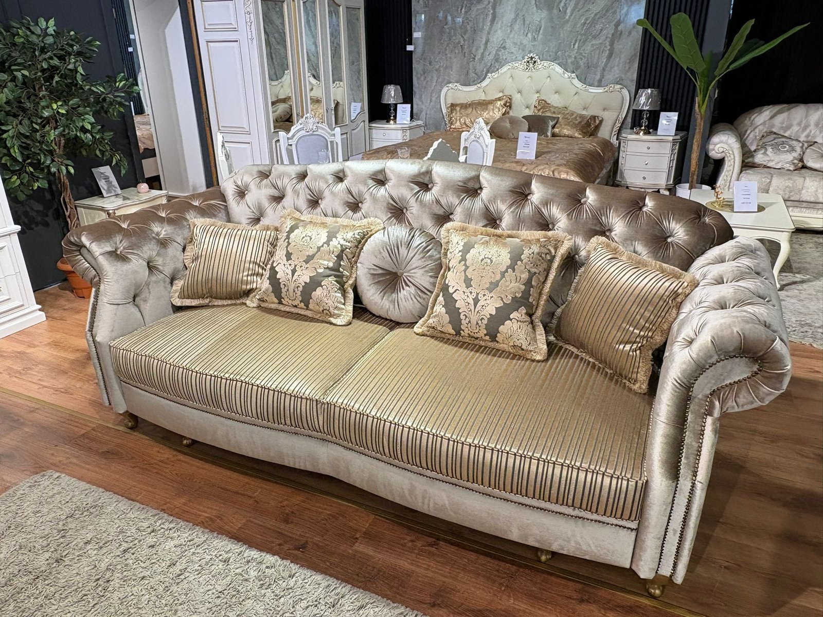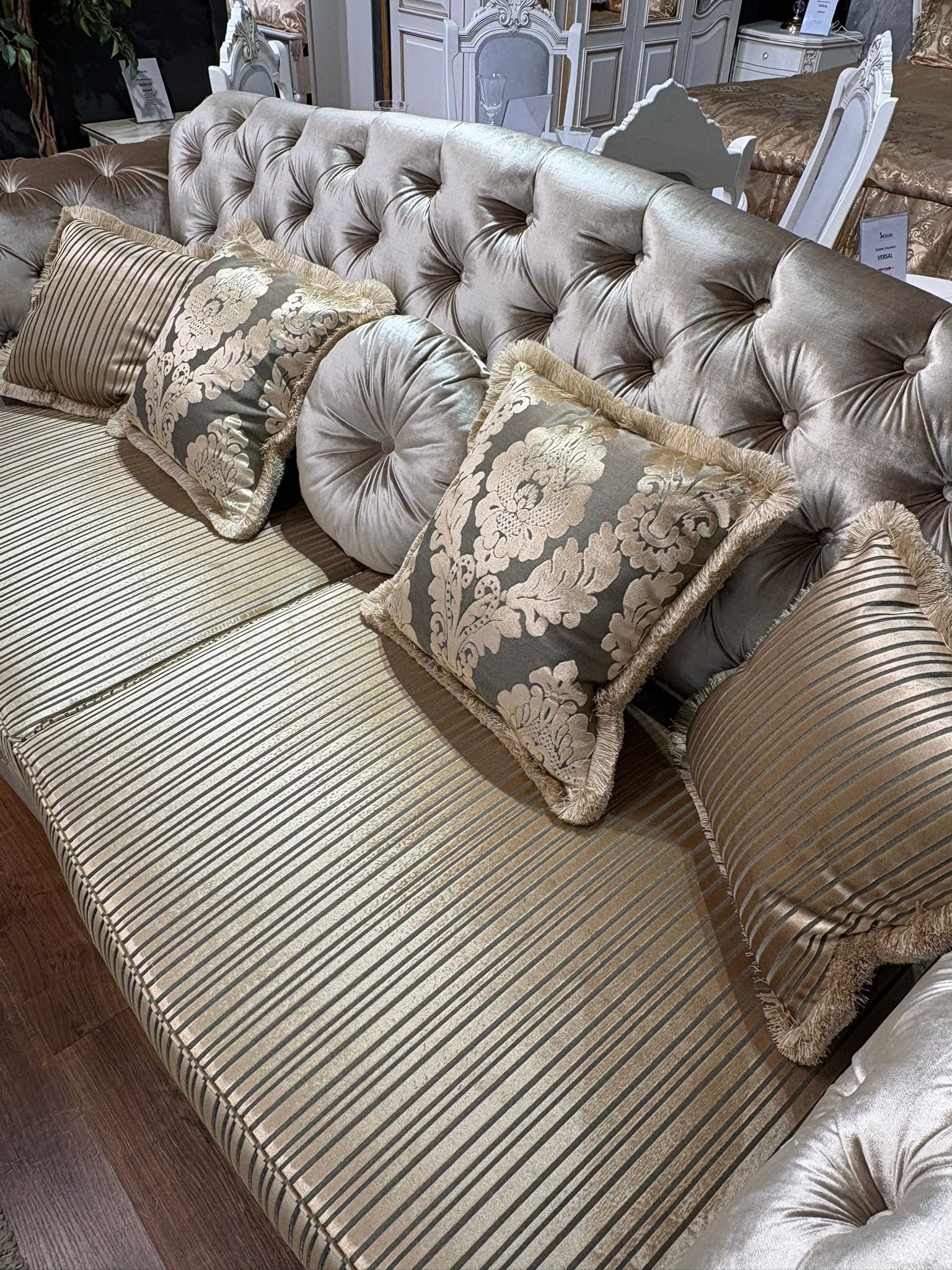 Baldai aptraukti blizgiu itališko dizaino veliūru, ant medinių kojelių, porankiai dekoruoti vinukais.
