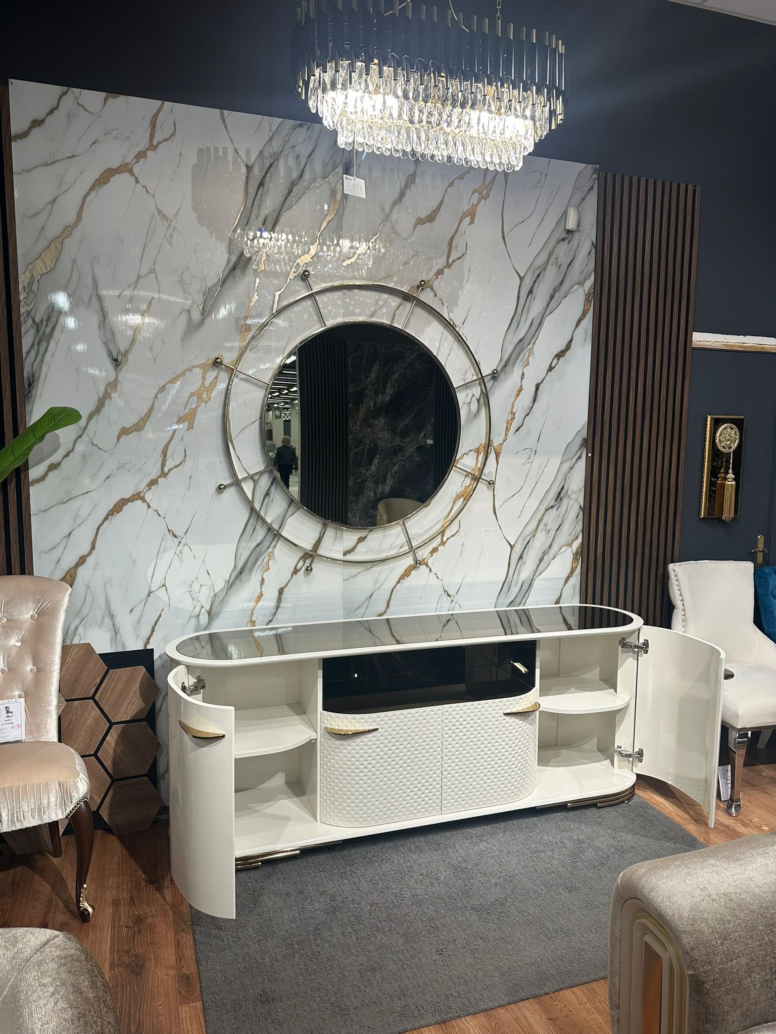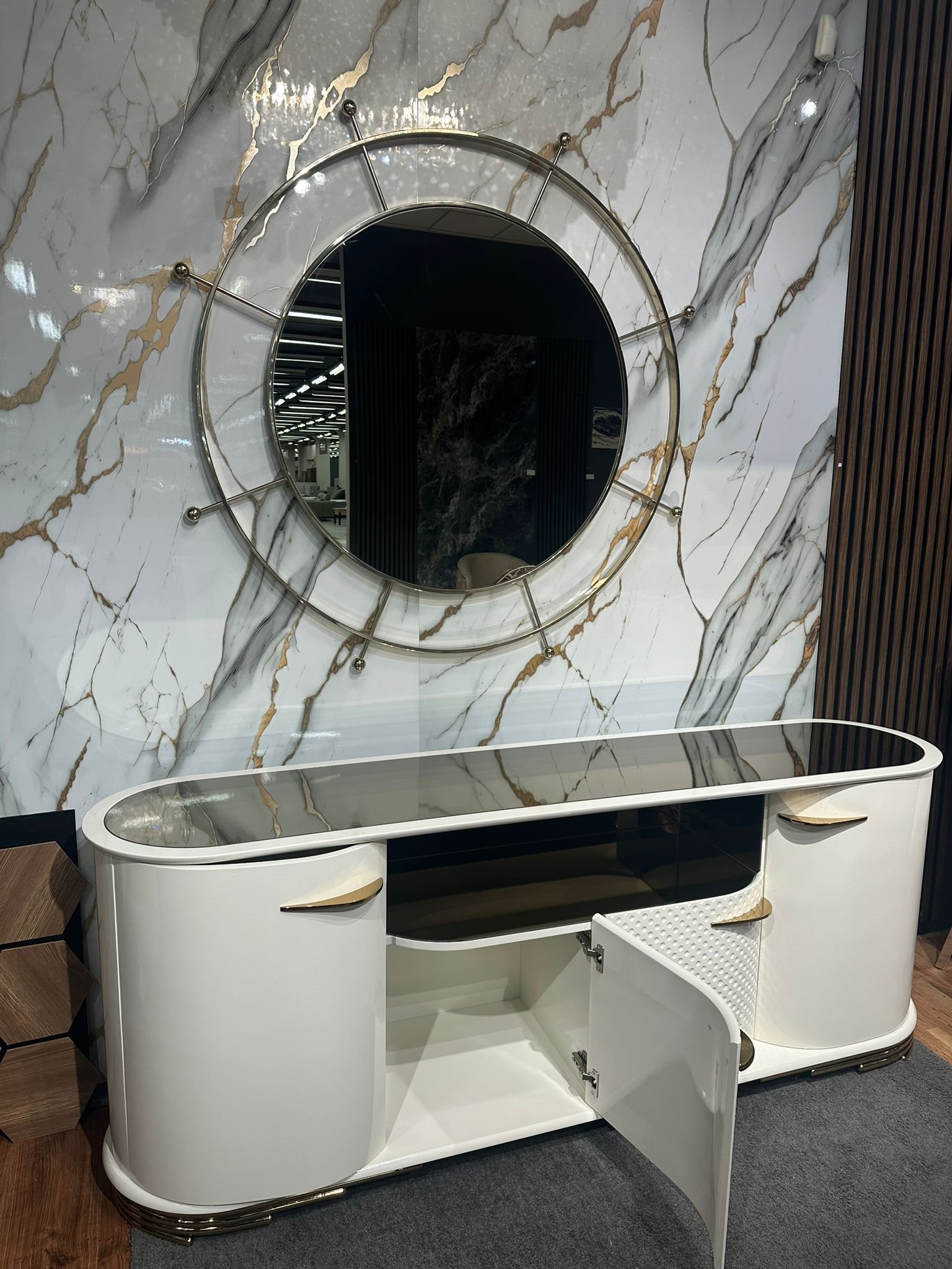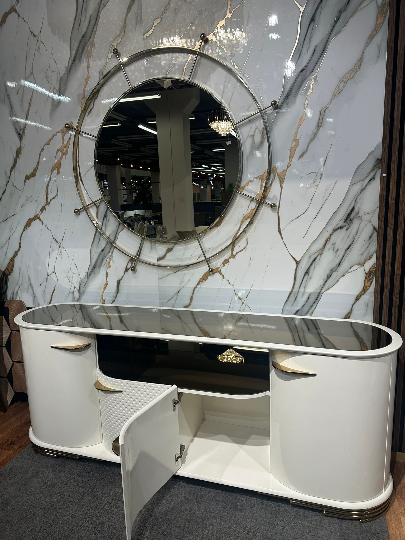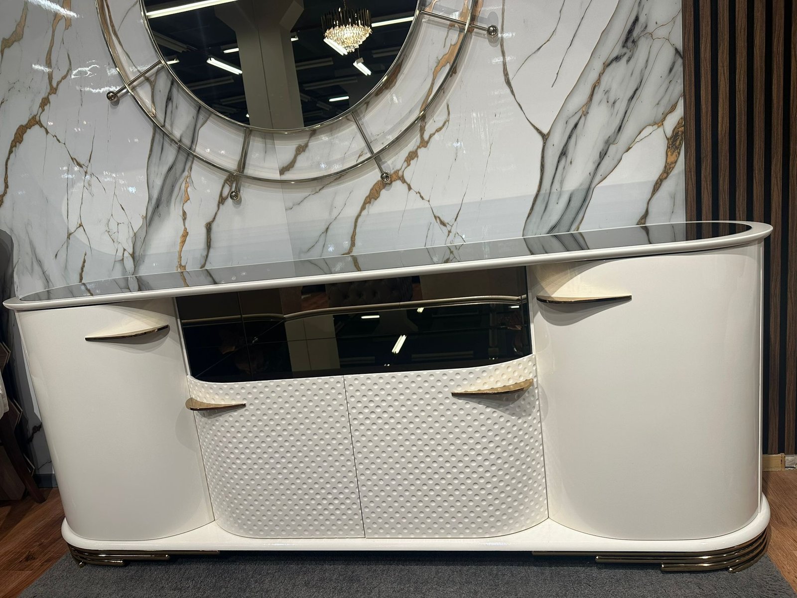 PARIS konsolė yra unikalaus dizaino ir moderni, todėl lengvai pritaikoma įvairiuose interjeruose. Jos elegantiškas stilius ir prabangos pojūtis suteiks jūsų svetainei ypatingos išskirtinumo. Konsolės matmenys 207(W) x 48(D) x 80(H) cm leidžia ją patogiai įkomponuoti net ir mažesnėse erdvėse.