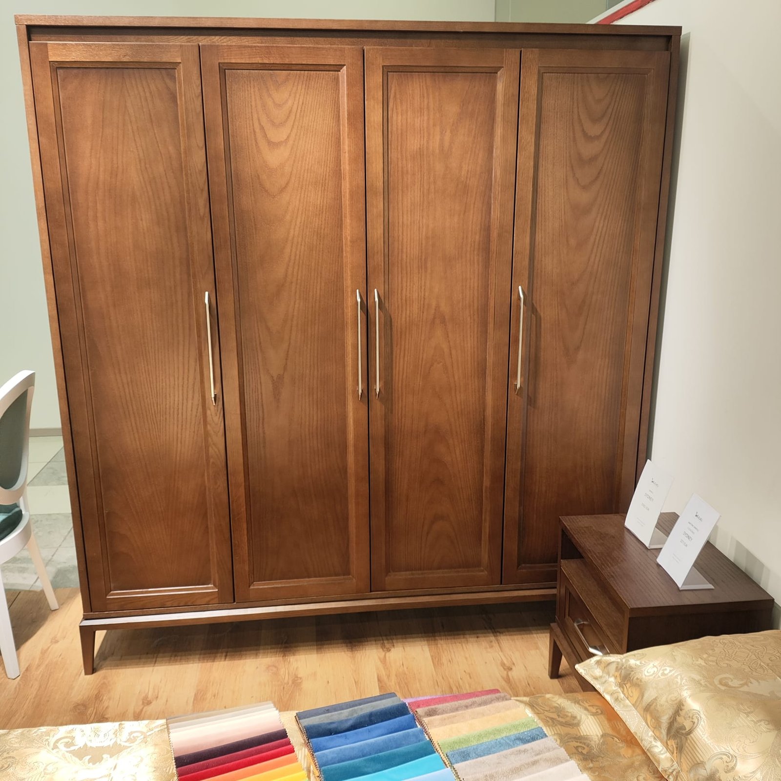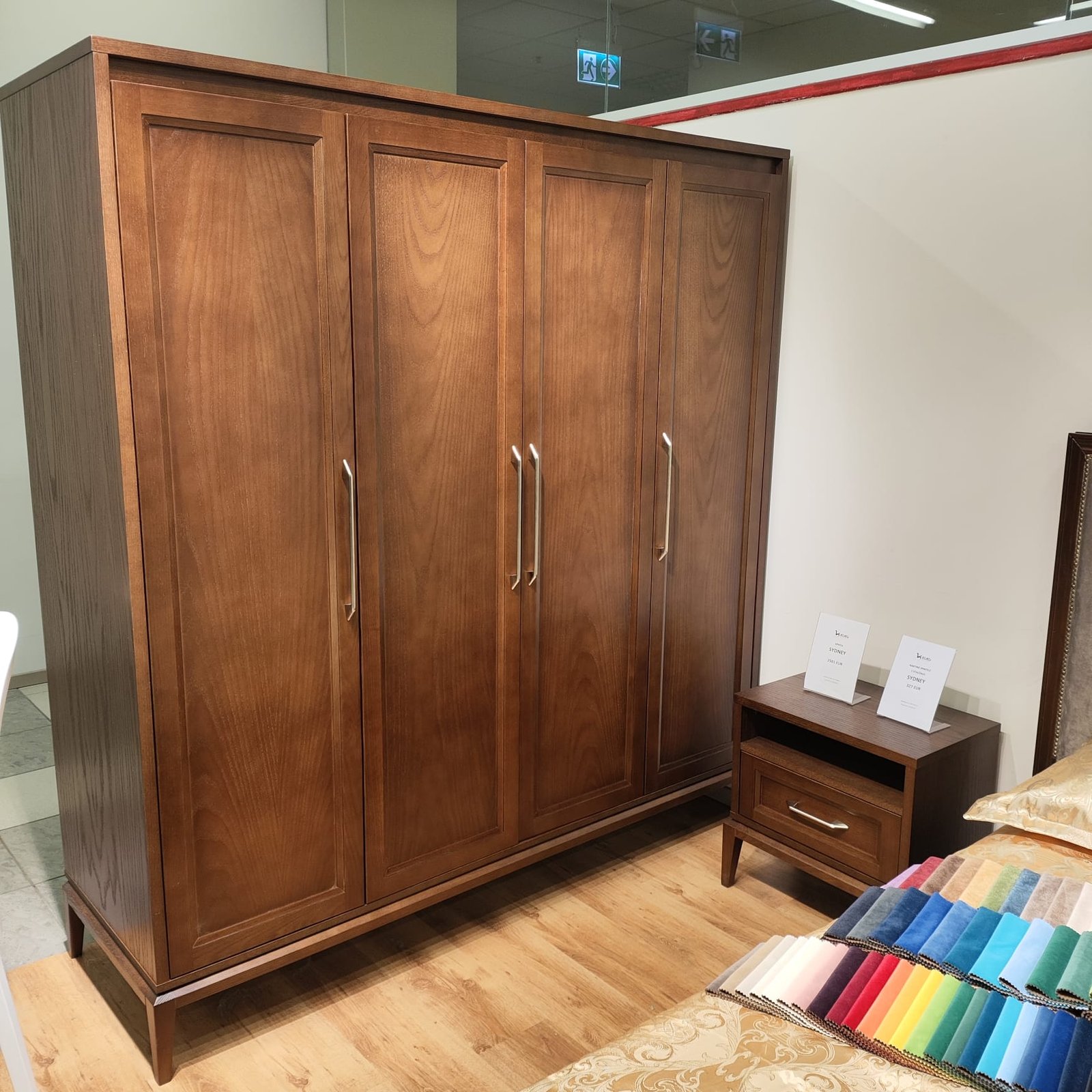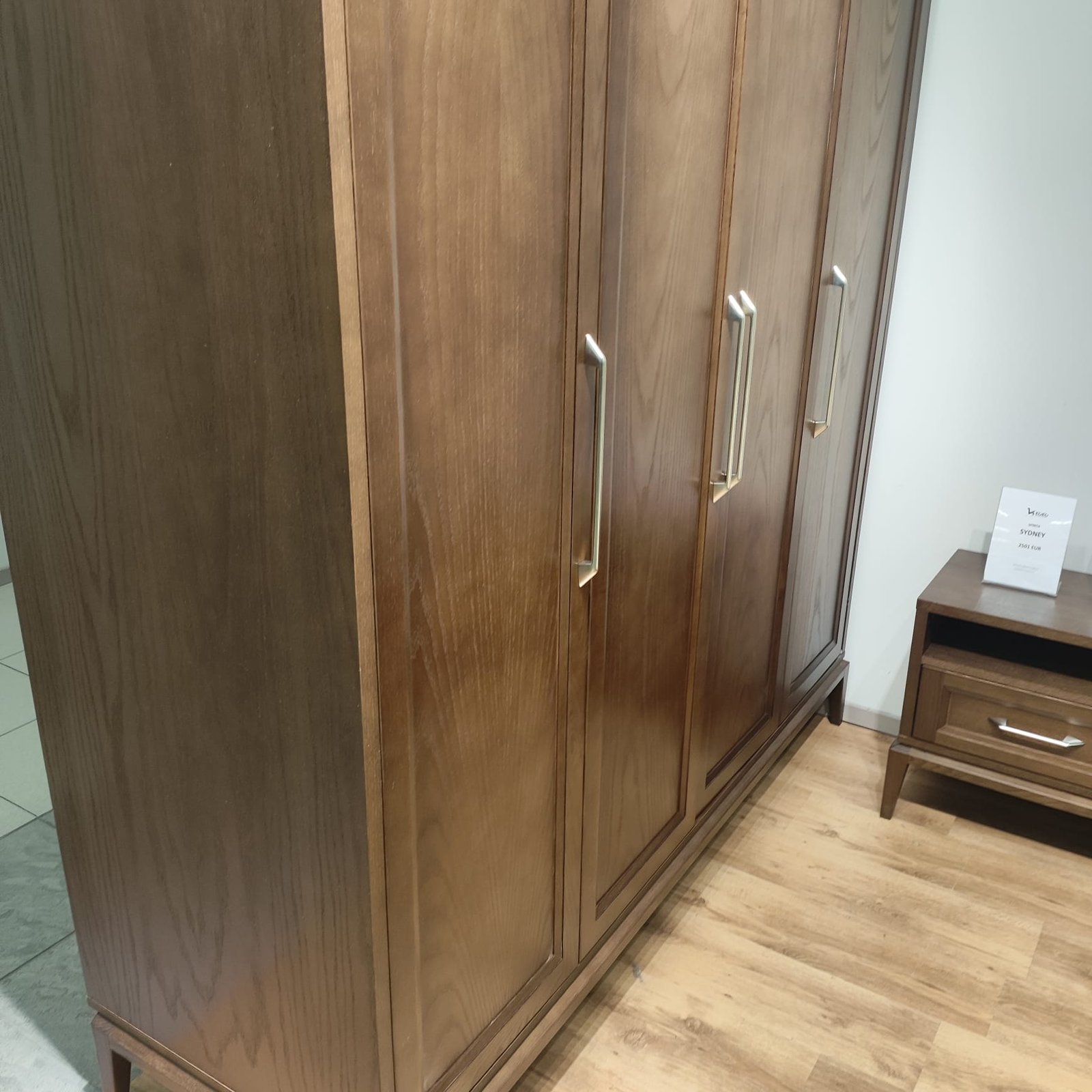 SYDNEY keturių durų spinta – tai puikus pasirinkimas ieškantiems talpaus, stilingo ir kokybiško baldo miegamajam ar kitai namų erdvei. Tamsus medienos atspalvis, subtiliai frezuotos durelės ir elegantiškos rankenos kuria švarų, išgrynintą dizainą, kuris lengvai derės prie įvairaus interjero.