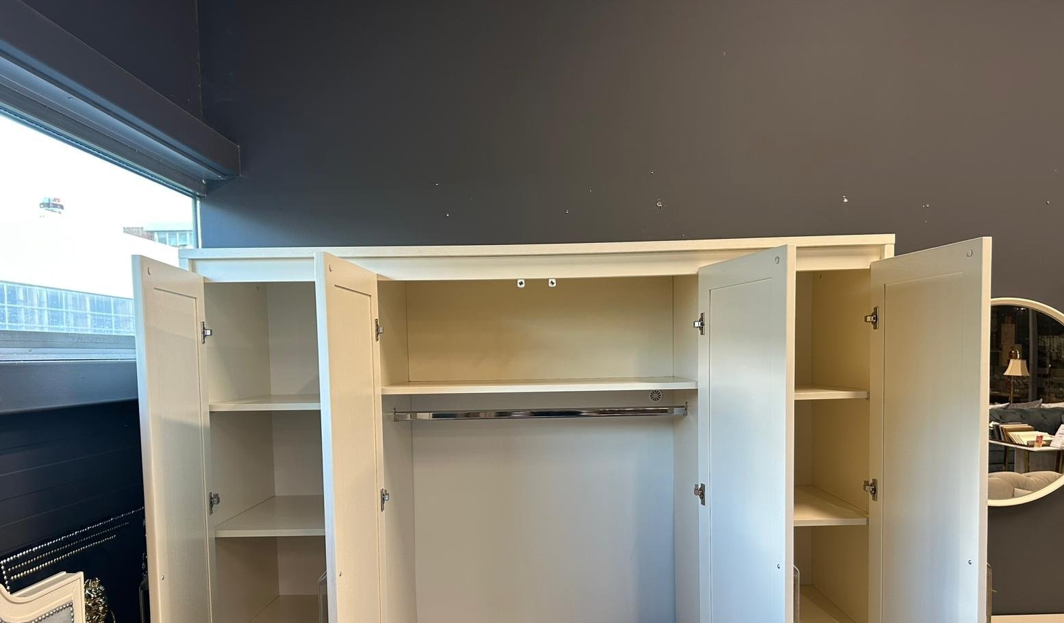 Spintos vidus puikiai suplanuotas – čia rasite tiek pakabinamus skyrius su skersiniu drabužiams, tiek lentynas daiktų organizavimui. Tai ne tik baldų estetiką išlaikantis sprendimas, bet ir ypač funkcionalus pasirinkimas kasdieniam naudojimui.