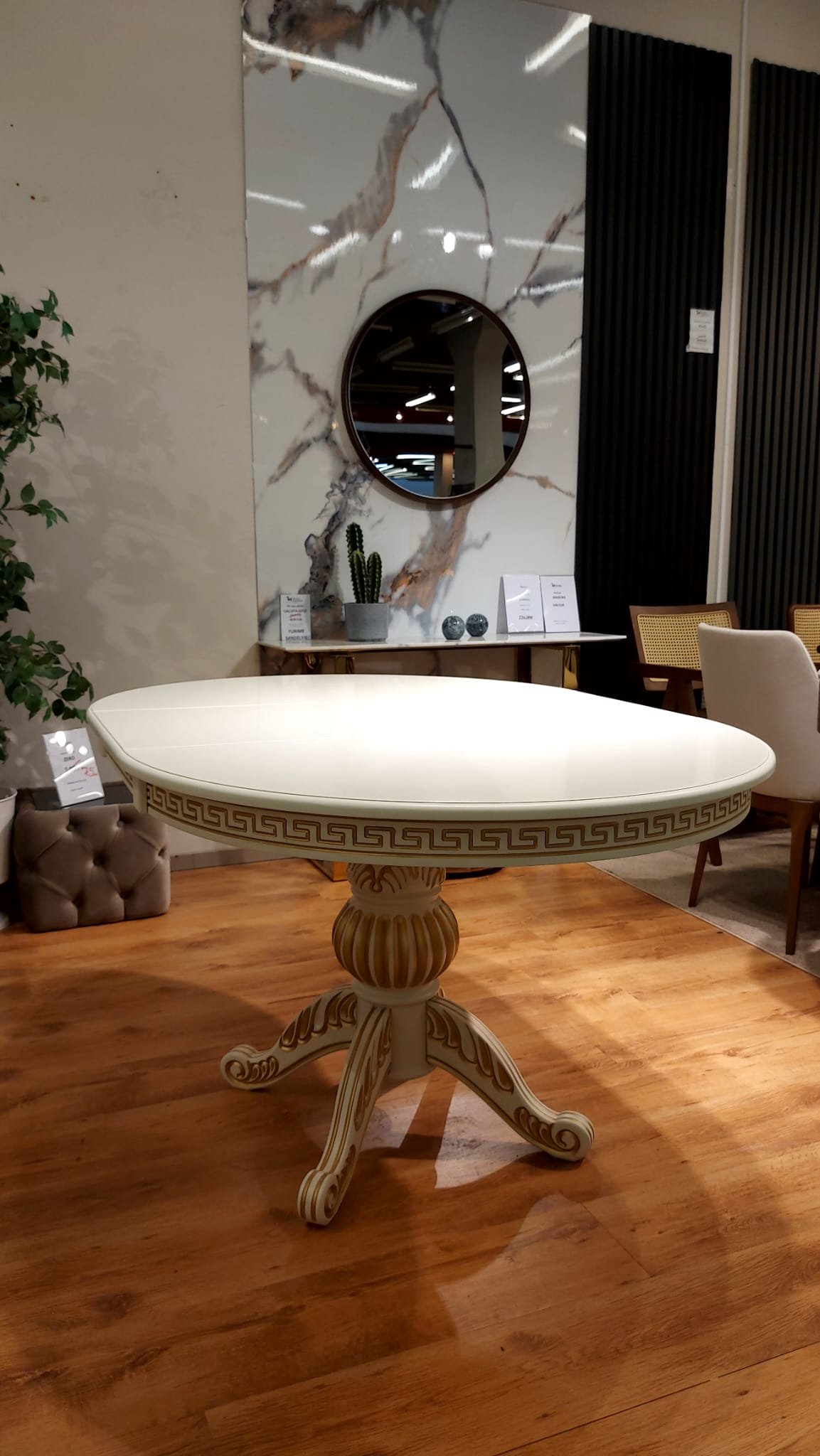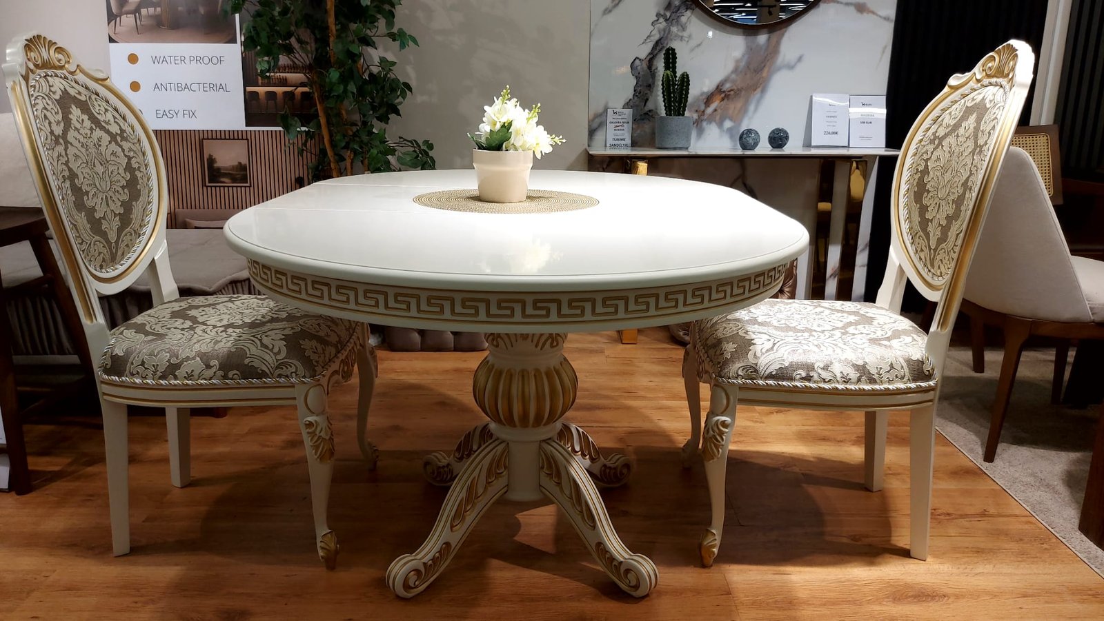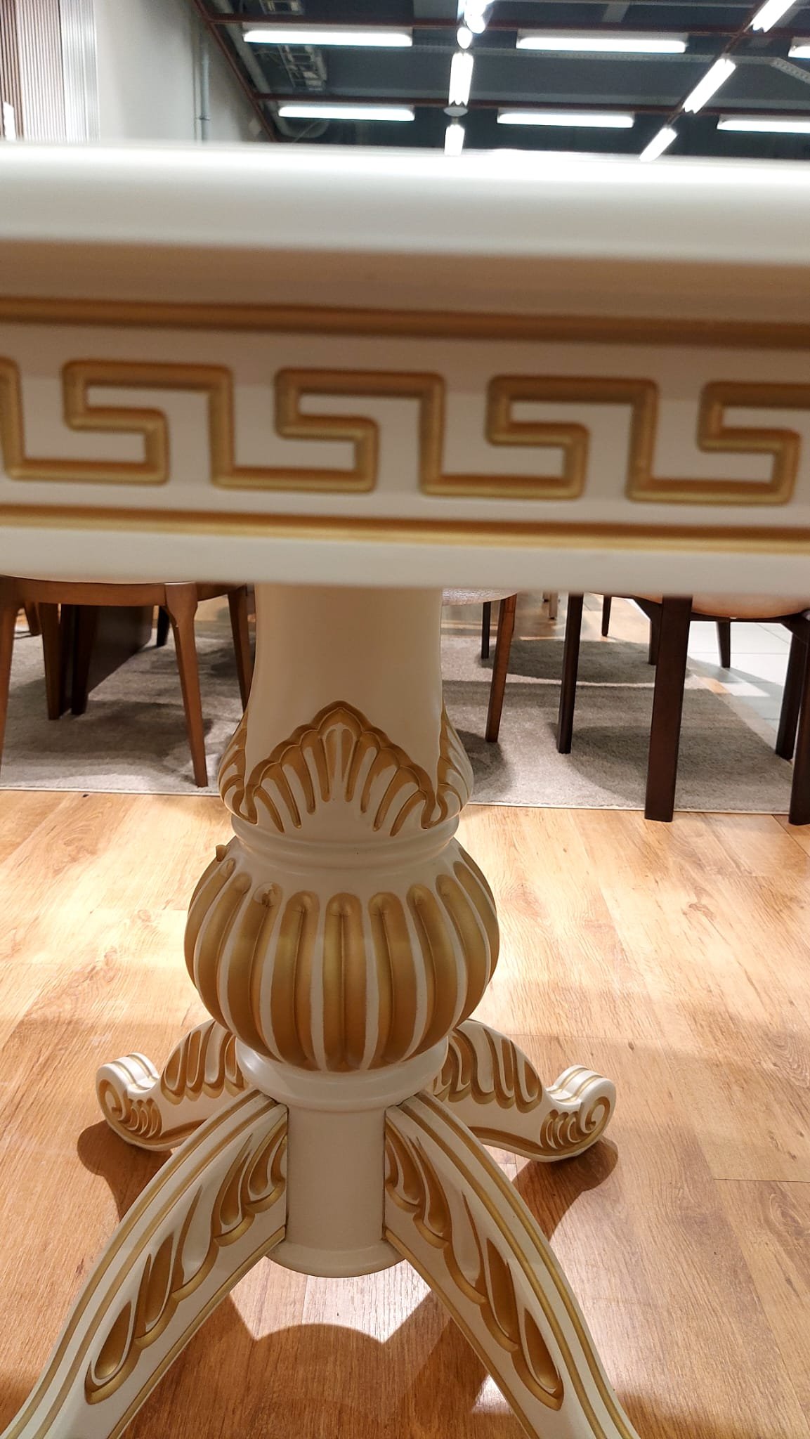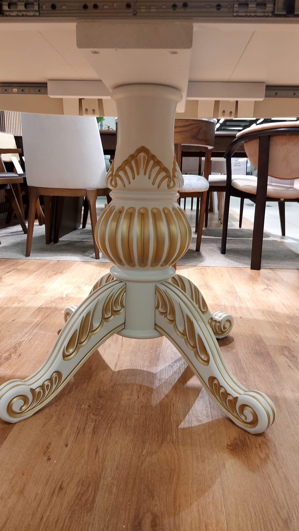 Stalas turi patogią prailginimo funkciją, leidžiančią padidinti stalviršio plotą pagal poreikį. Stilingas pagrindas su dekoratyviais raižiniais suteikia jam prabangos įspūdį.