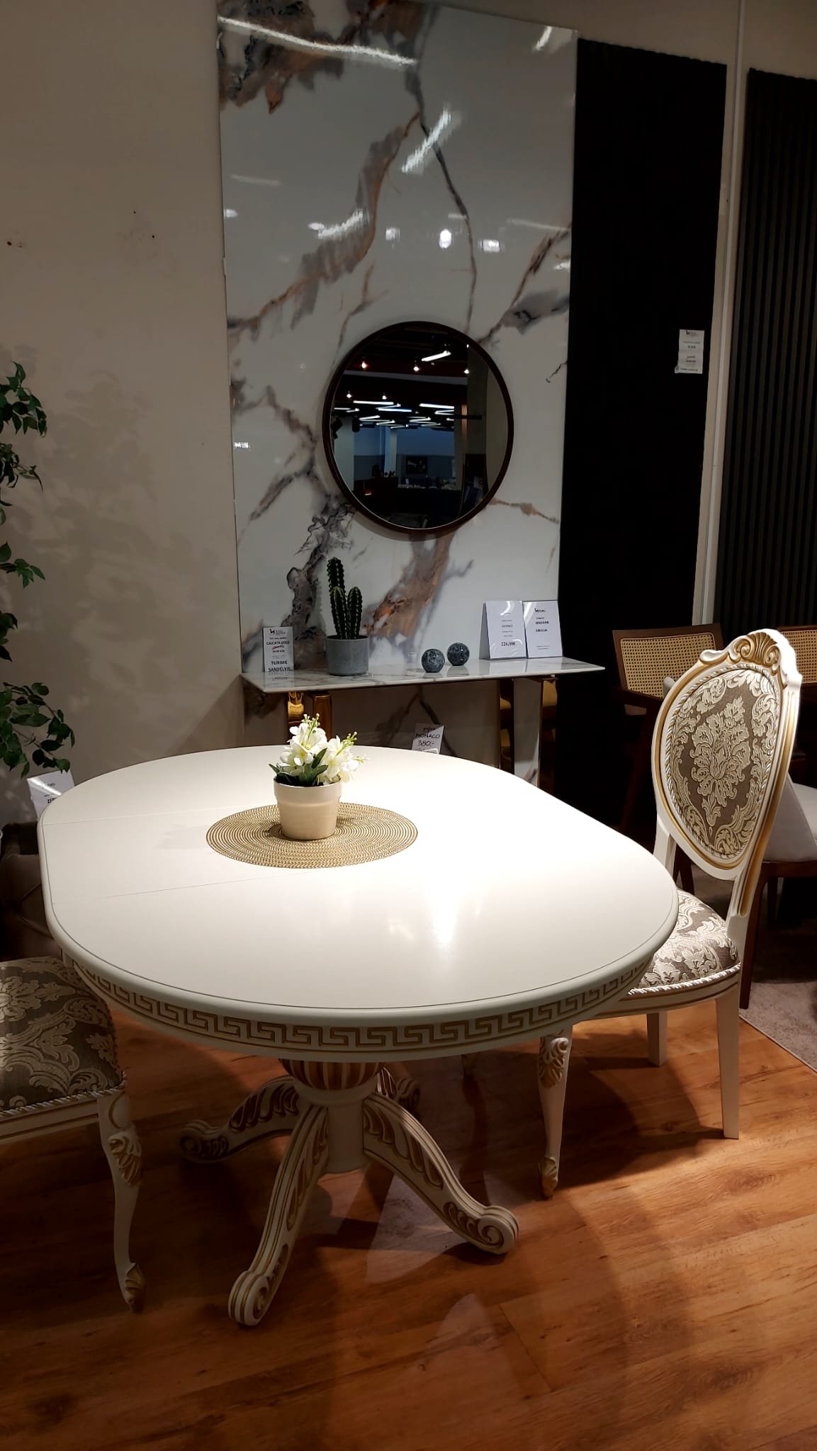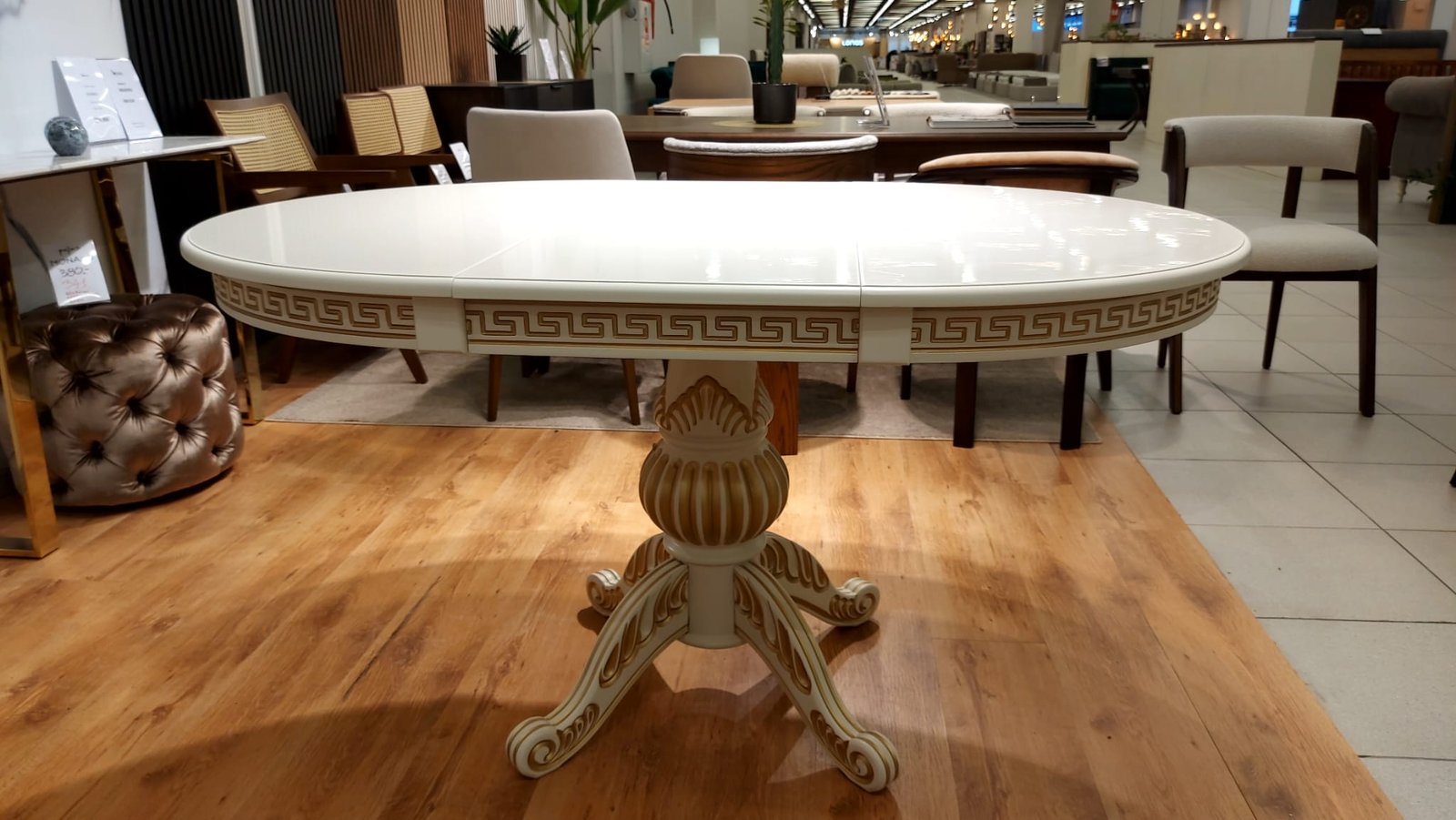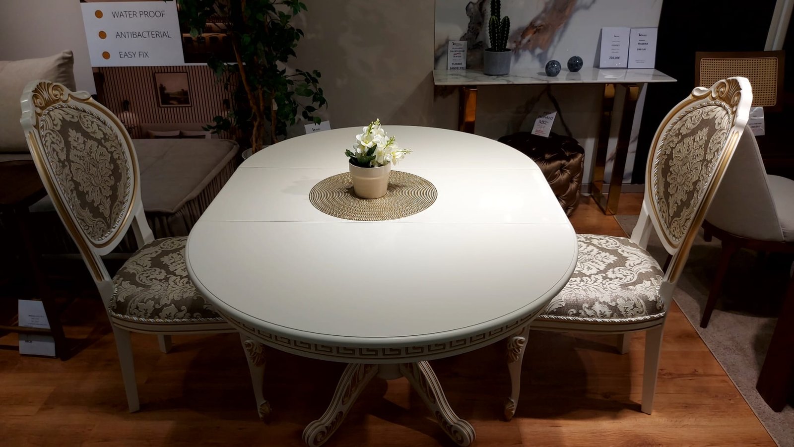 Stalas turi patogią prailginimo funkciją, leidžiančią padidinti stalviršio plotą pagal poreikį. Stilingas pagrindas su dekoratyviais raižiniais suteikia jam prabangos įspūdį.