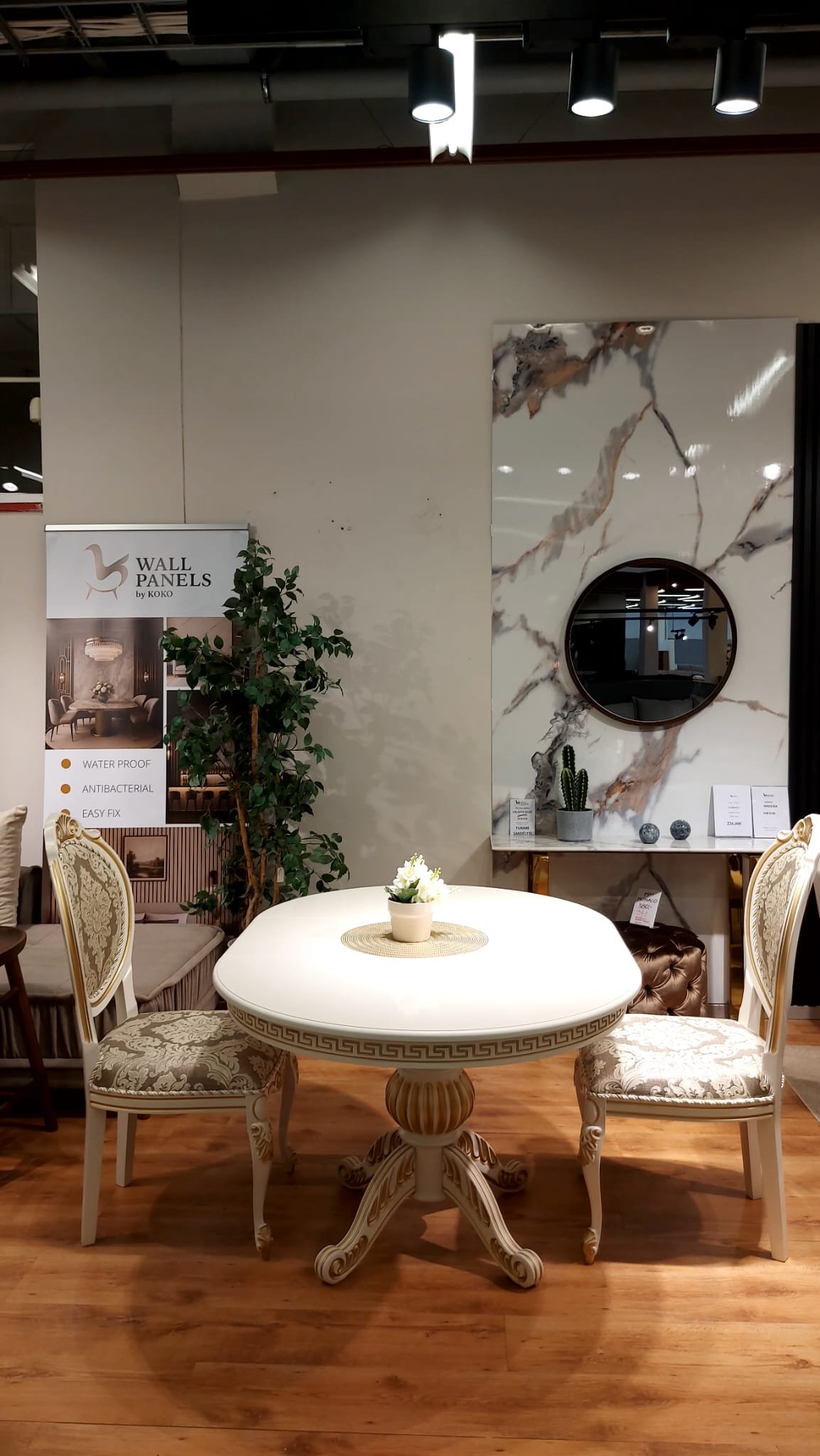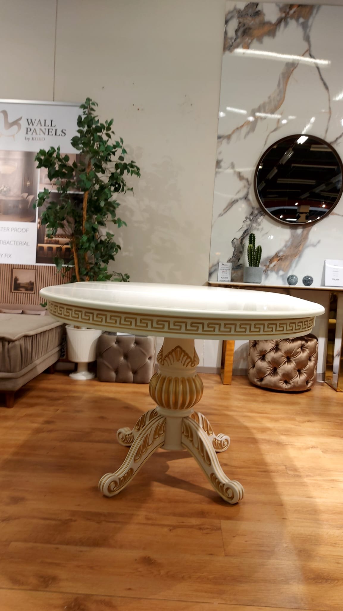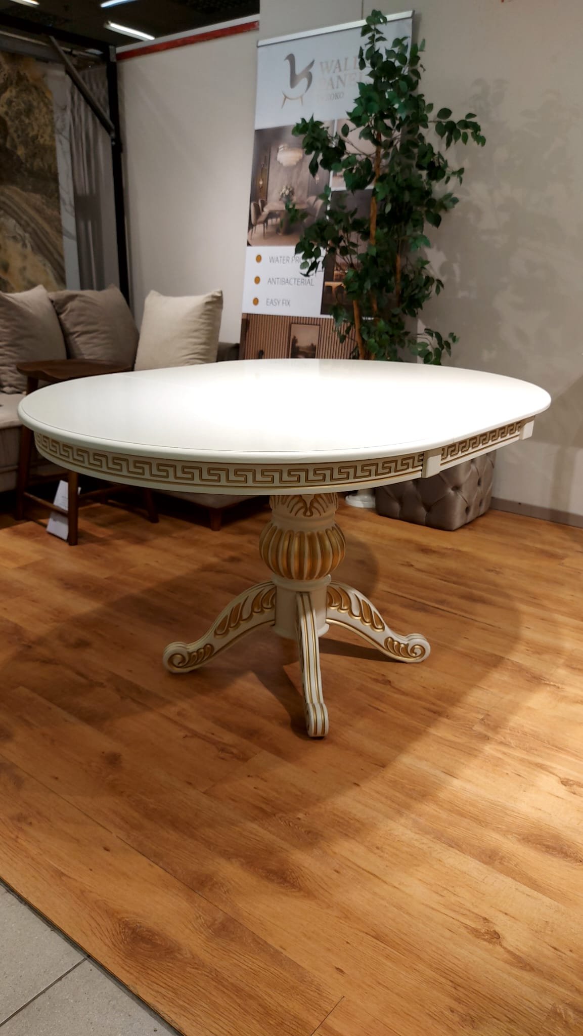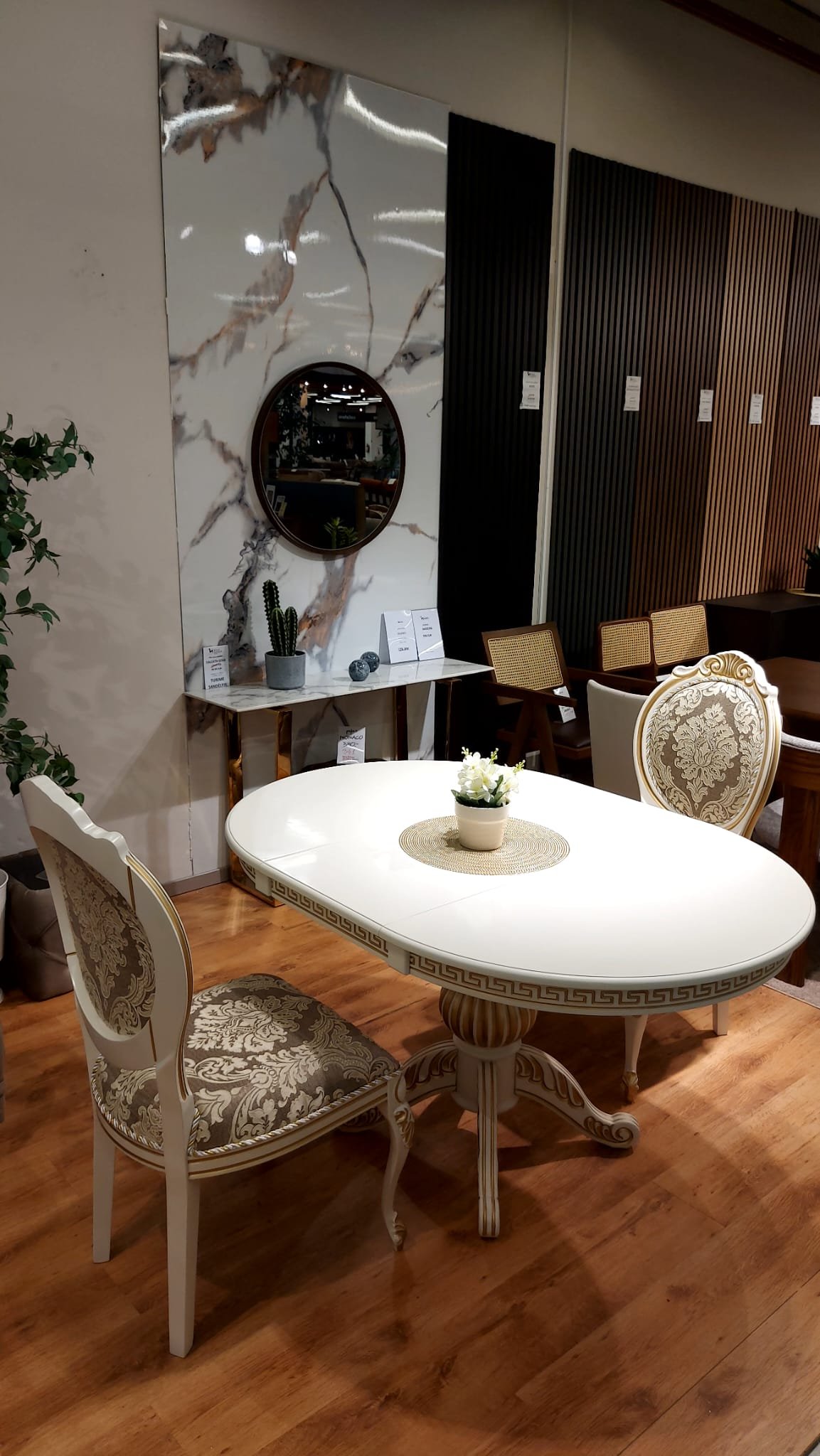 Stalas turi patogią prailginimo funkciją, leidžiančią padidinti stalviršio plotą pagal poreikį. Stilingas pagrindas su dekoratyviais raižiniais suteikia jam prabangos įspūdį.