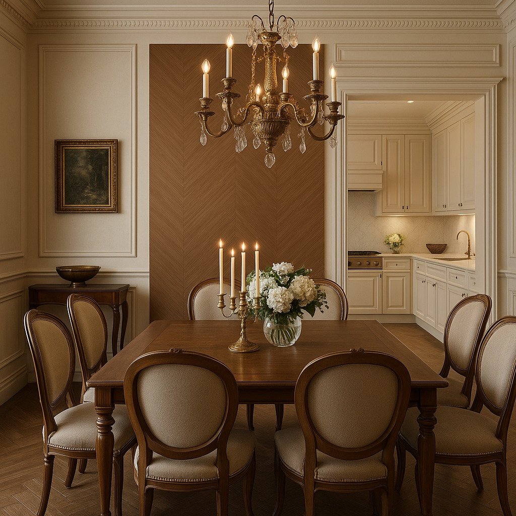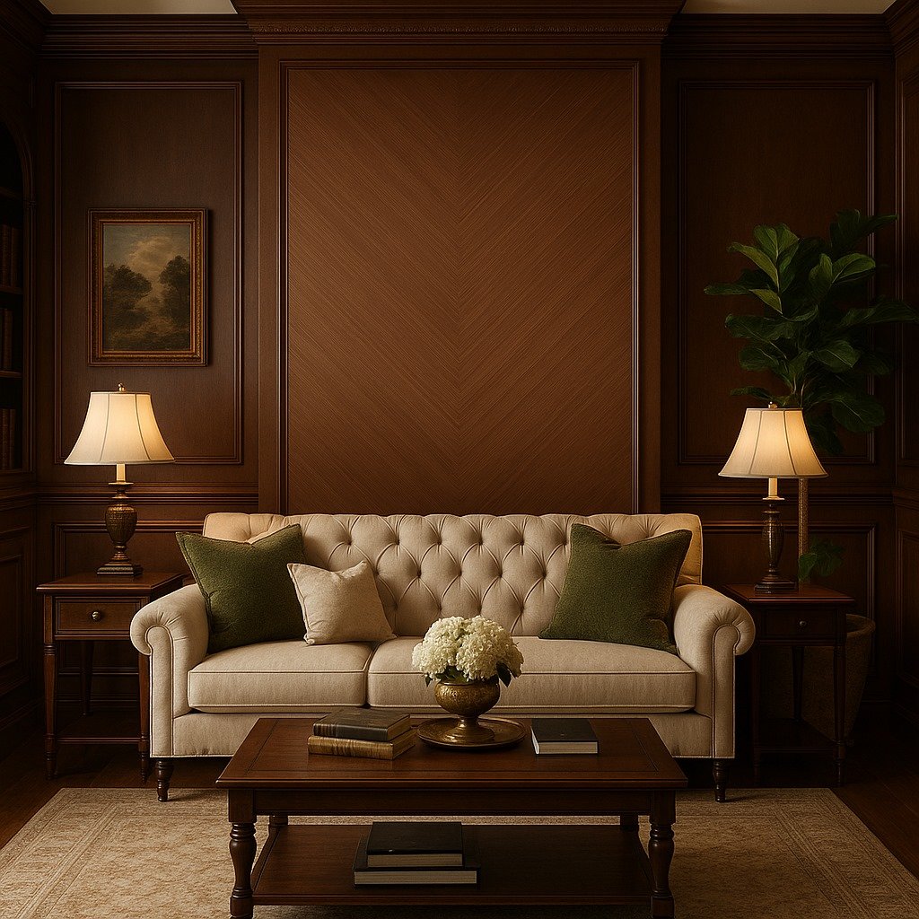 Puikiai tinka reprezentacinėms erdvėms – viešbučiams, biurams, restoranams ar namų interjerams. Tamsus riešutmedžio tonas suteikia erdvei šilumos ir rafinuoto charakterio, o eglutės raštas paverčia sieną tikru dizaino akcentu.