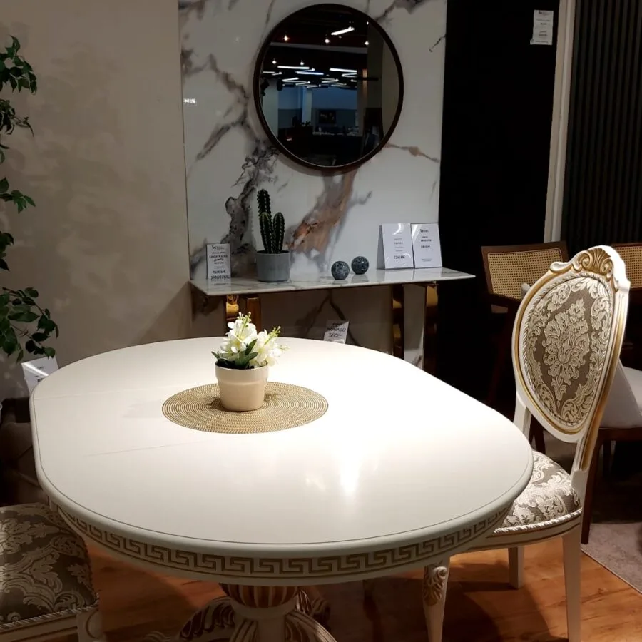 1740,00 €Original price was: 1740,00 €.1620,00 €Current price is: 1620,00 €.GRAF išskleidžiamas klasikinis stalas (baltas su auksu)